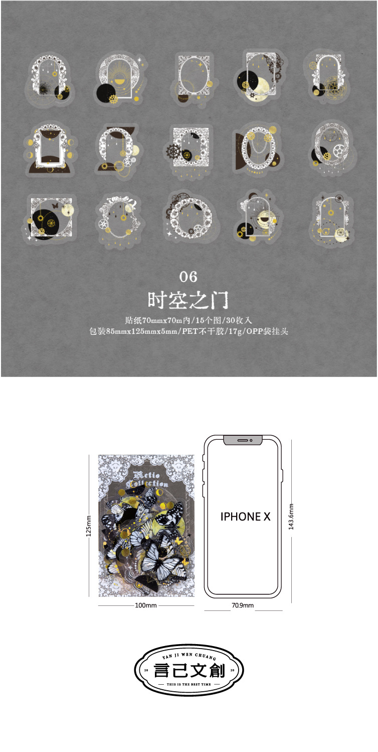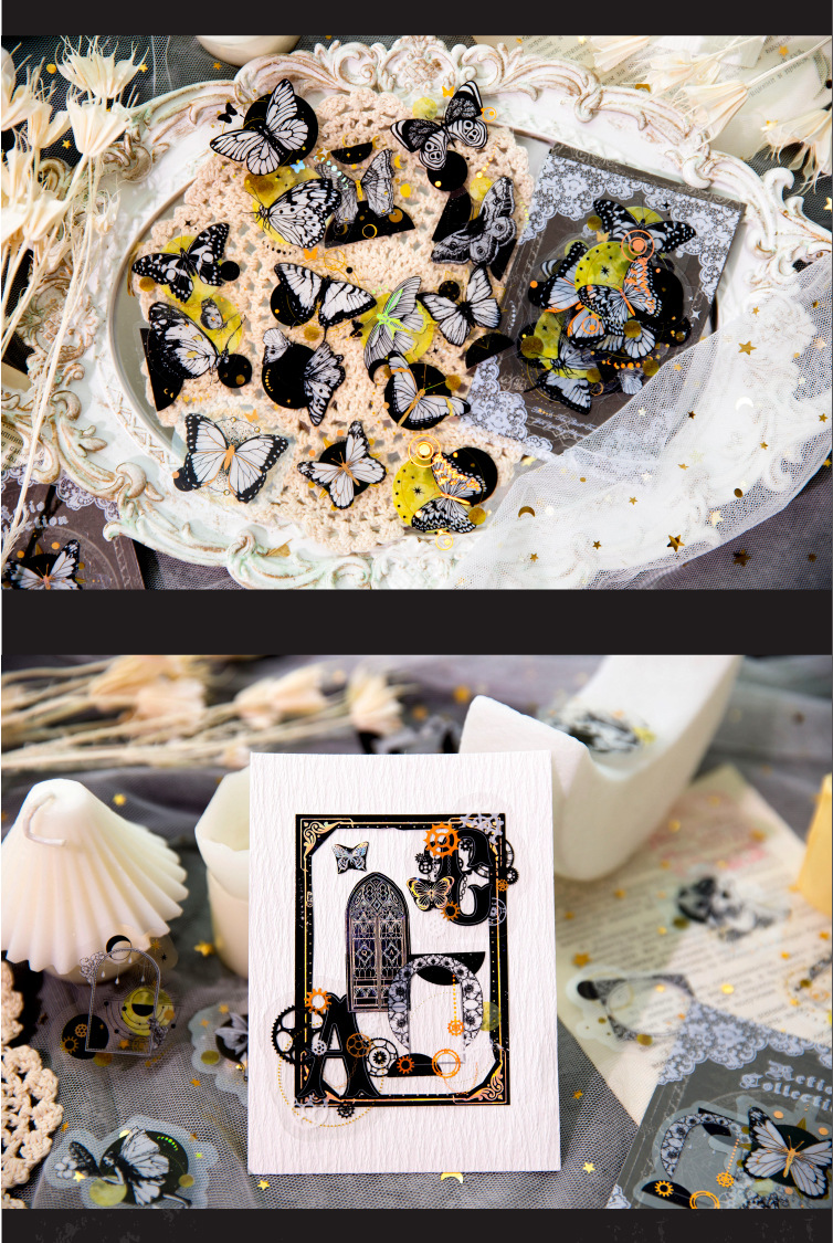 시간과 영원 시리즈 PET 레이저 골드 스티커 가방 레트로 디지털 영어 나비 핸드북 스티커스토어 가기