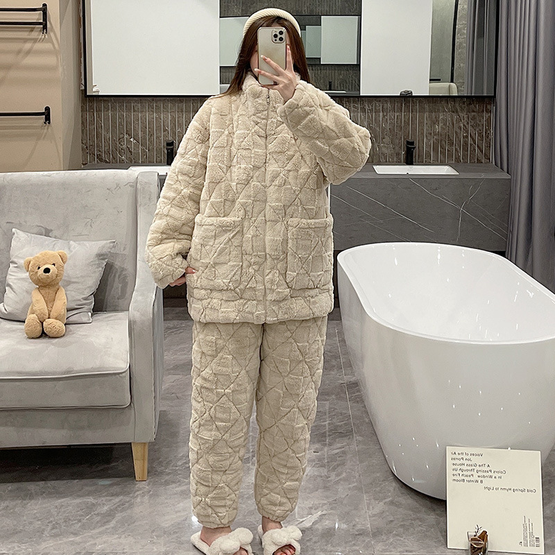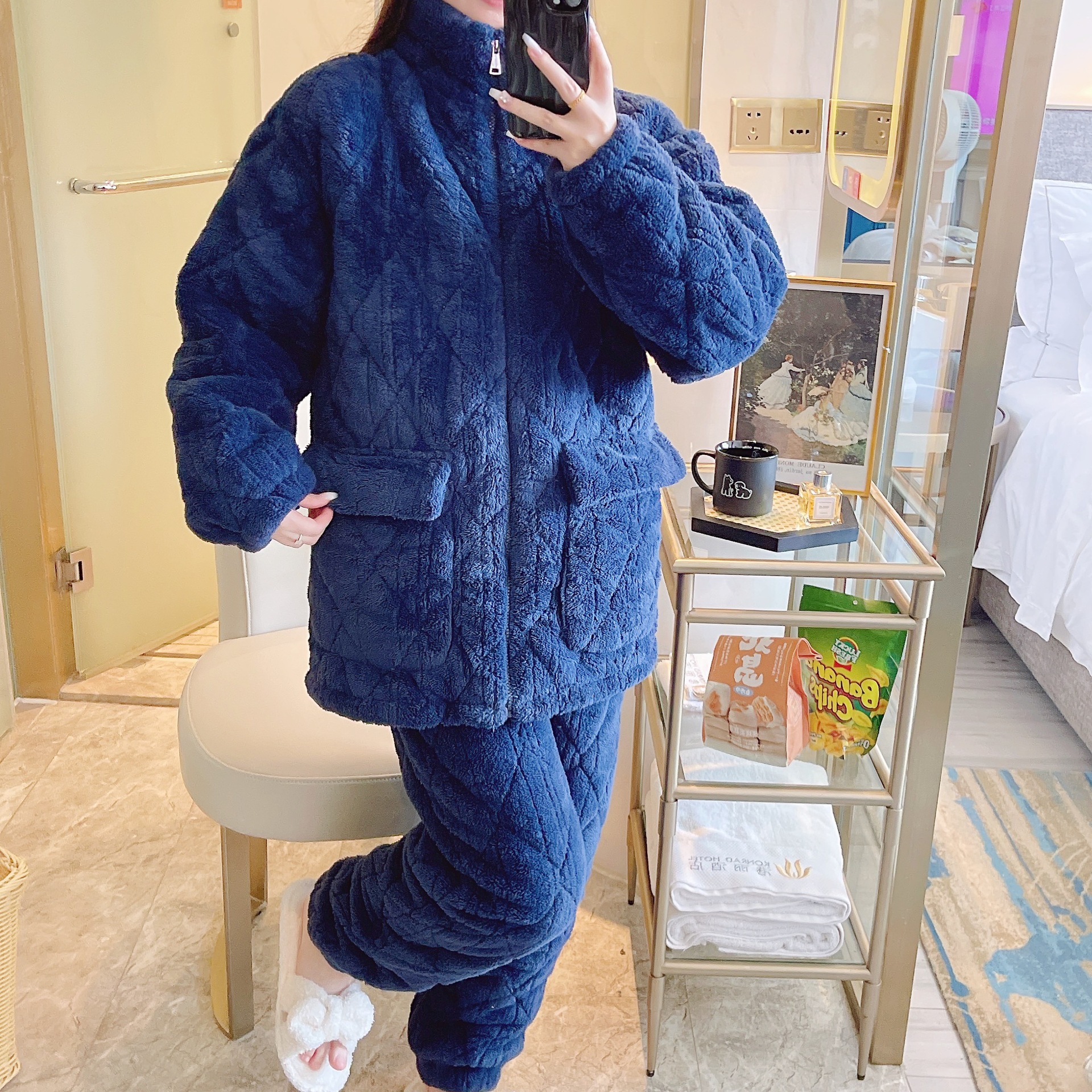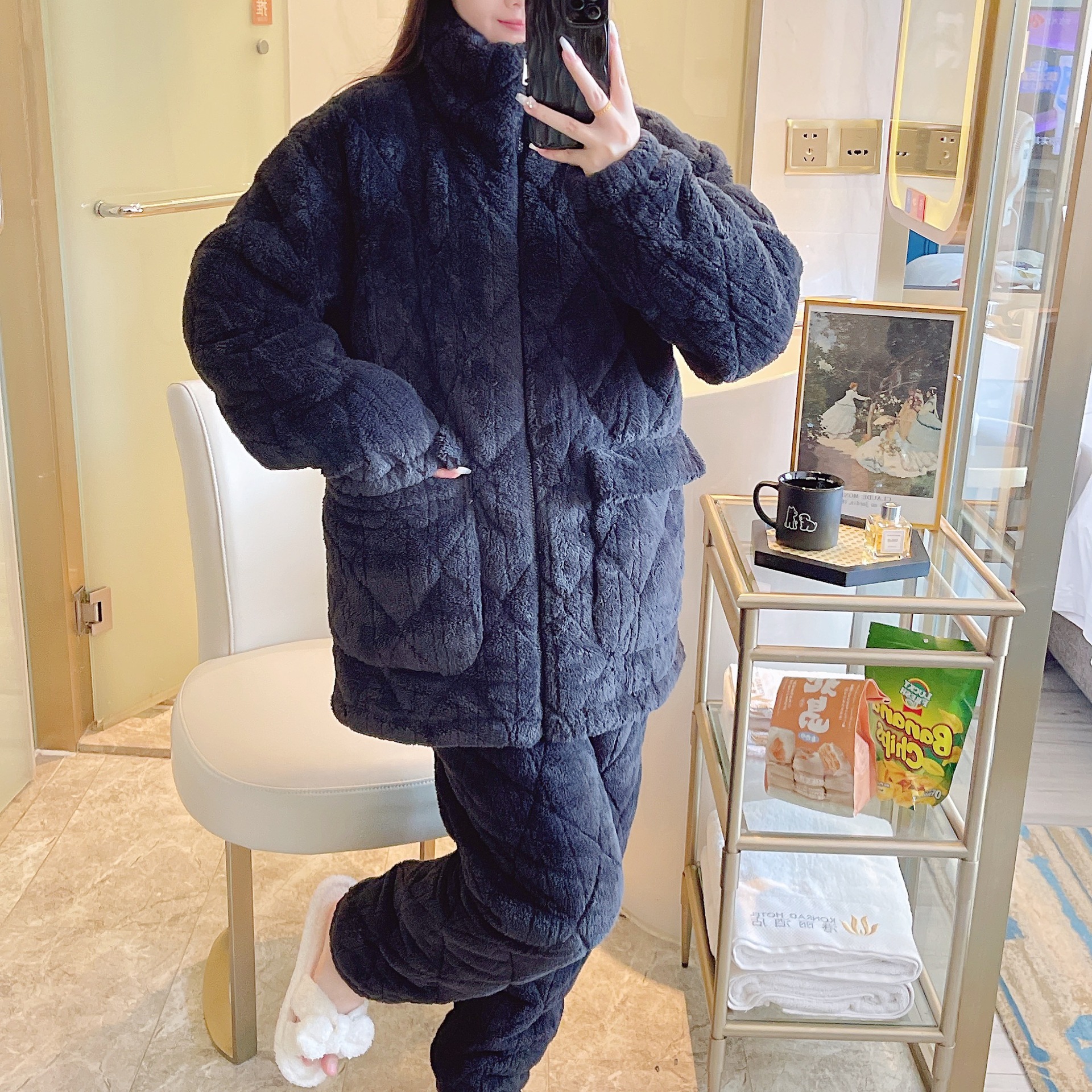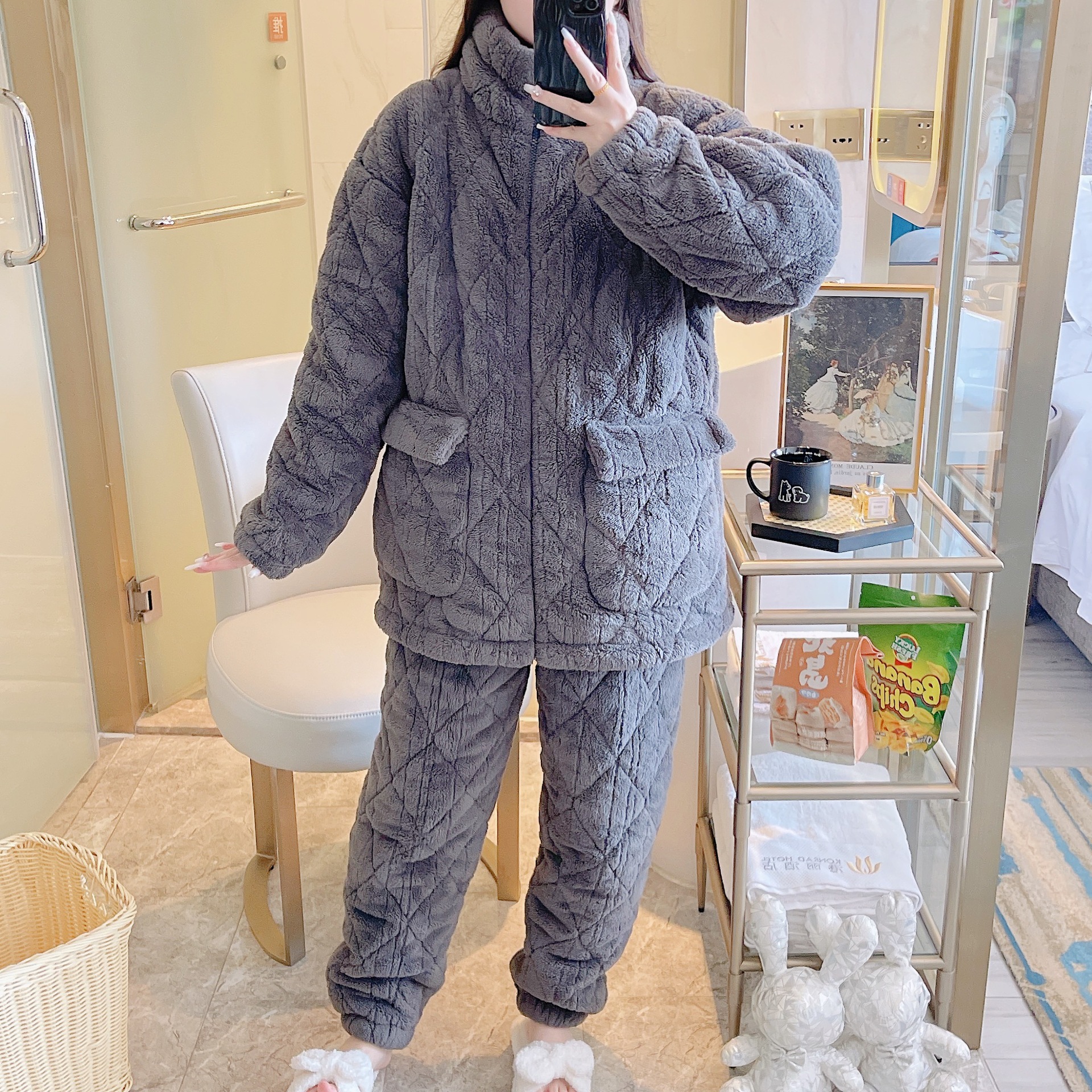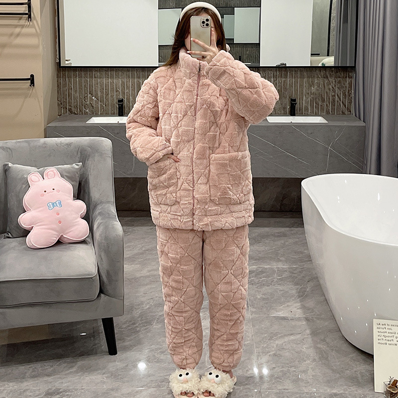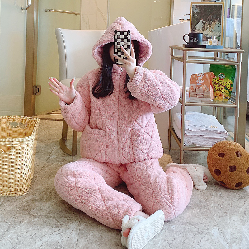 플러스 사이즈 파자마 여성의 가을과 겨울 두꺼운 3 층 코튼 두꺼운 외부 착용 홈웨어 플란넬 세트 핑크스토어 가기