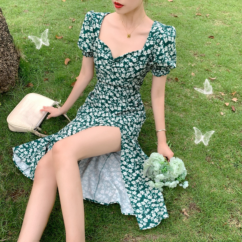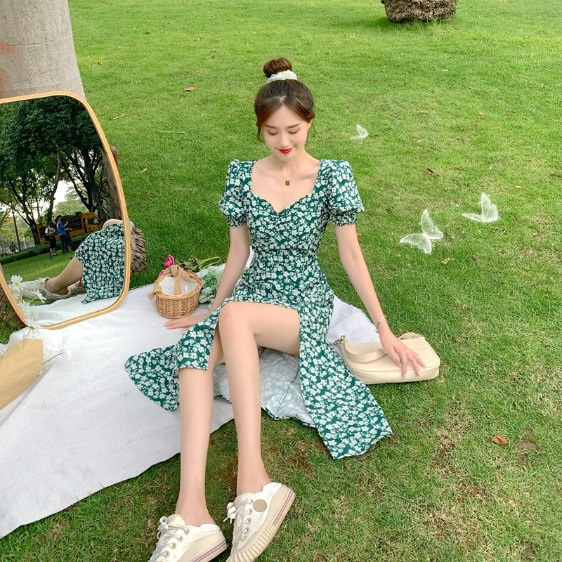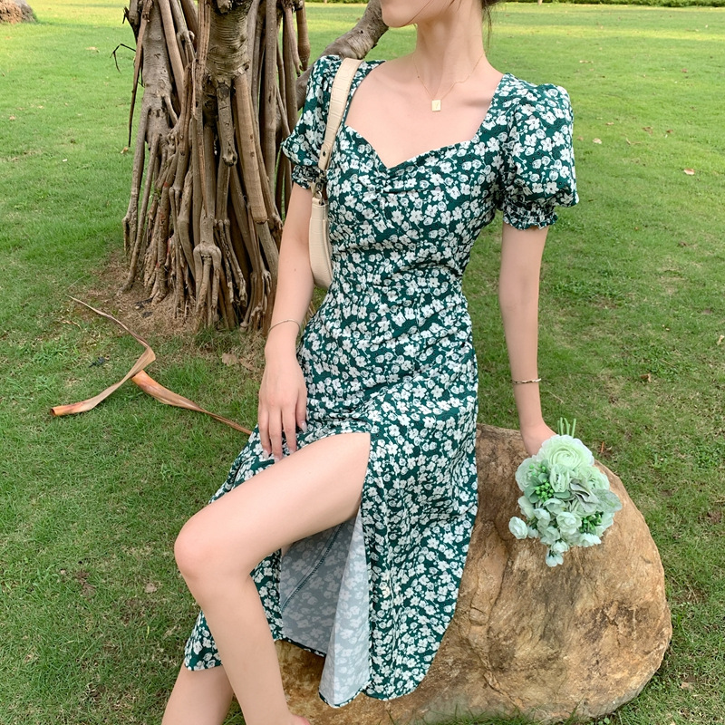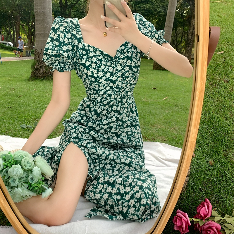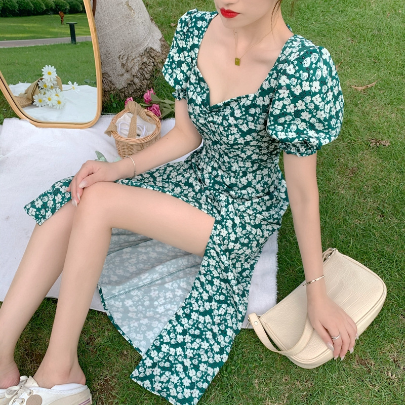 여름 새로운 화이트 그린 원피스 일본 학생 스퀘어 칼라 퍼프 슬리브 여성용 꽉 허리 사이드 슬릿 꽃 원피스스토어 가기