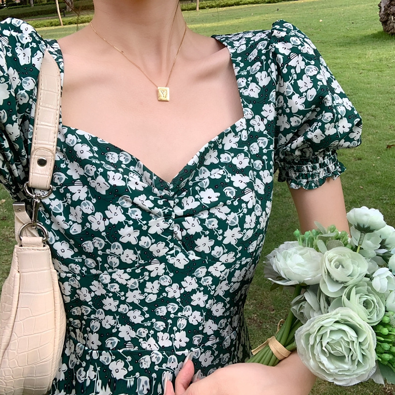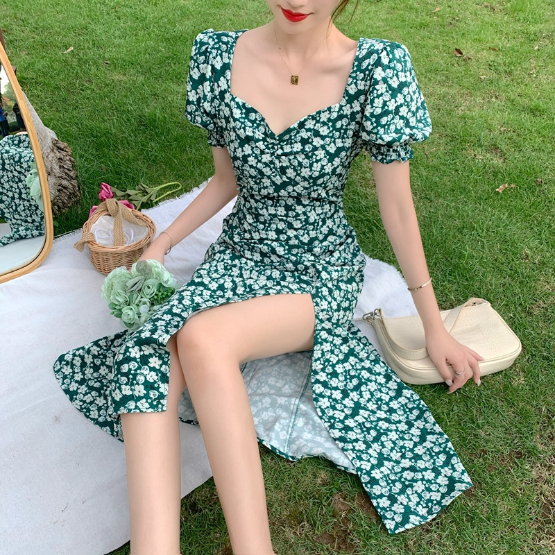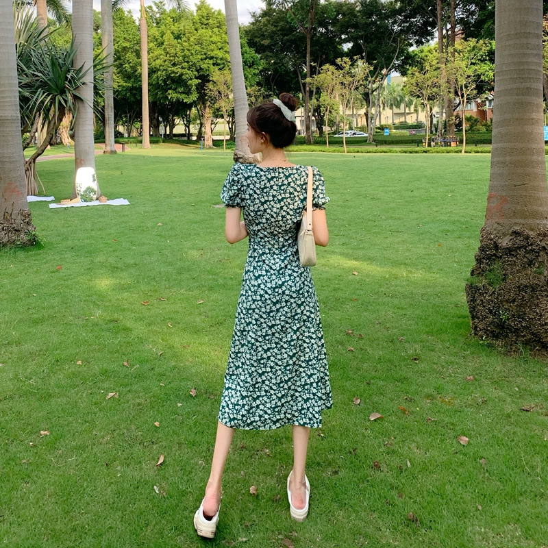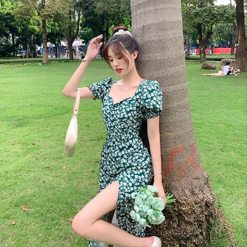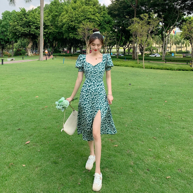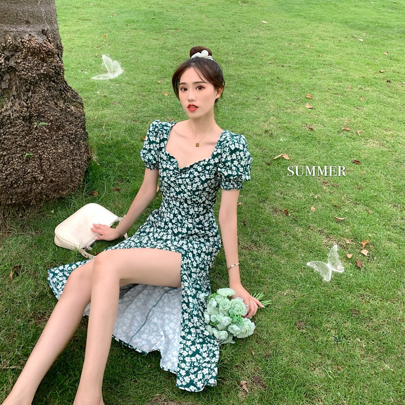 여름 새로운 화이트 그린 원피스 일본 학생 스퀘어 칼라 퍼프 슬리브 여성용 꽉 허리 사이드 슬릿 꽃 원피스스토어 가기