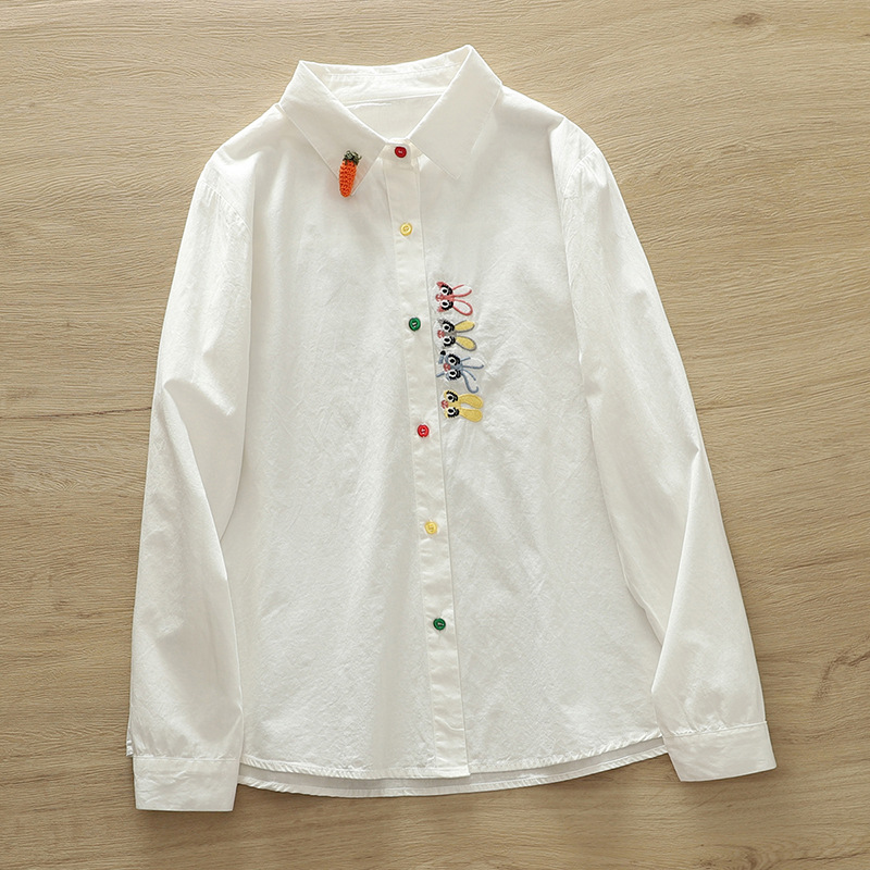 수 놓은 토끼 긴팔 셔츠 모리 스타일 신선한 심플 라펠 버튼 솔리드 컬러 여성용 모든 매치 캐주얼 셔츠