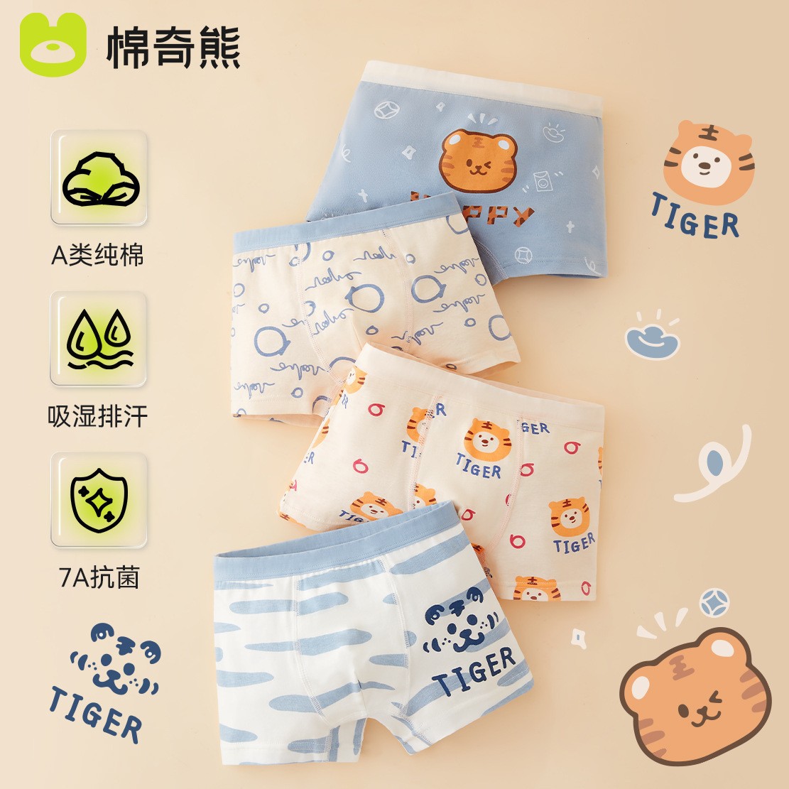 • B093 만화 호랑이-4 팩 클래스 A 순면 항균 가랑이