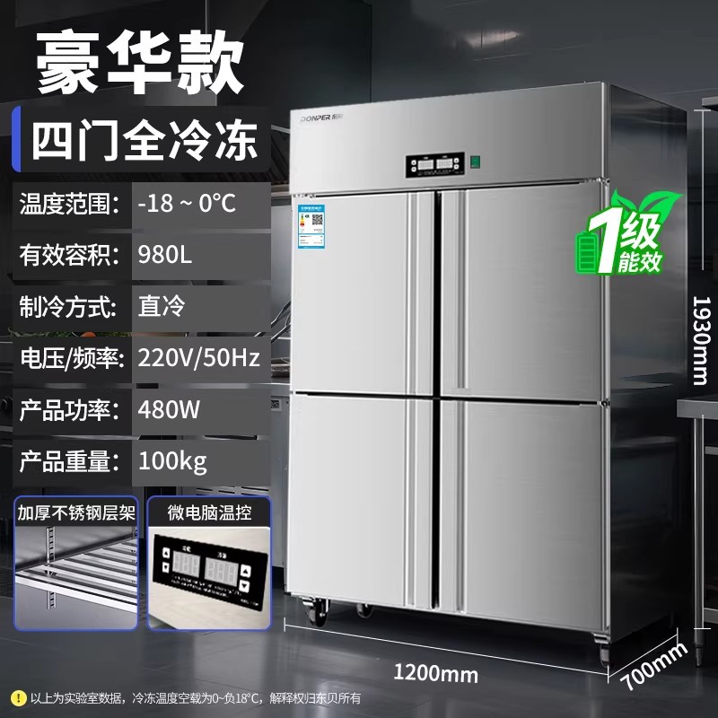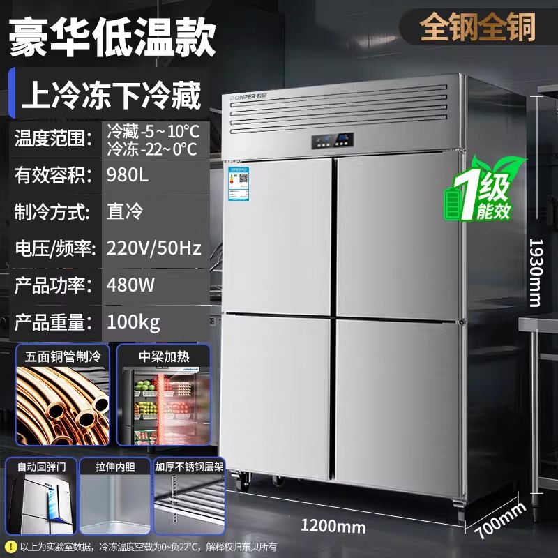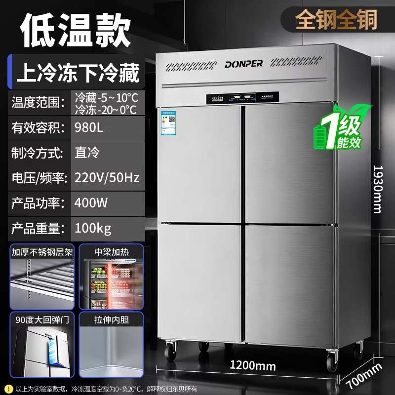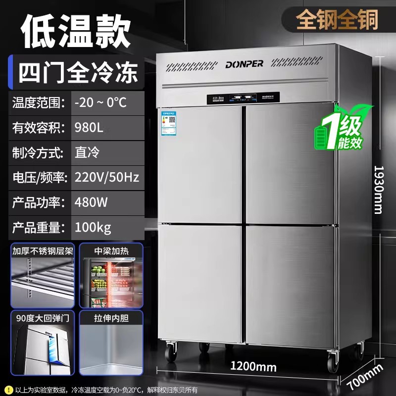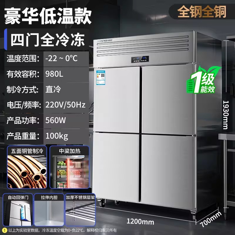 • 【최고 등급 에너지 효율/저온형】 4도어 냉동고/980L/전체 스틸 & 풀 구리/스테인리스 선반/중앙 빔 가열