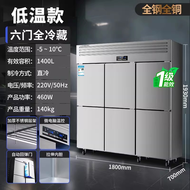 • 【최고 등급 에너지 효율/저온형】 6도어 냉장고 / 1400L / 풀 스테인리스 & 풀 구리 / 스테인리스 선반 / 자동 반동 도어