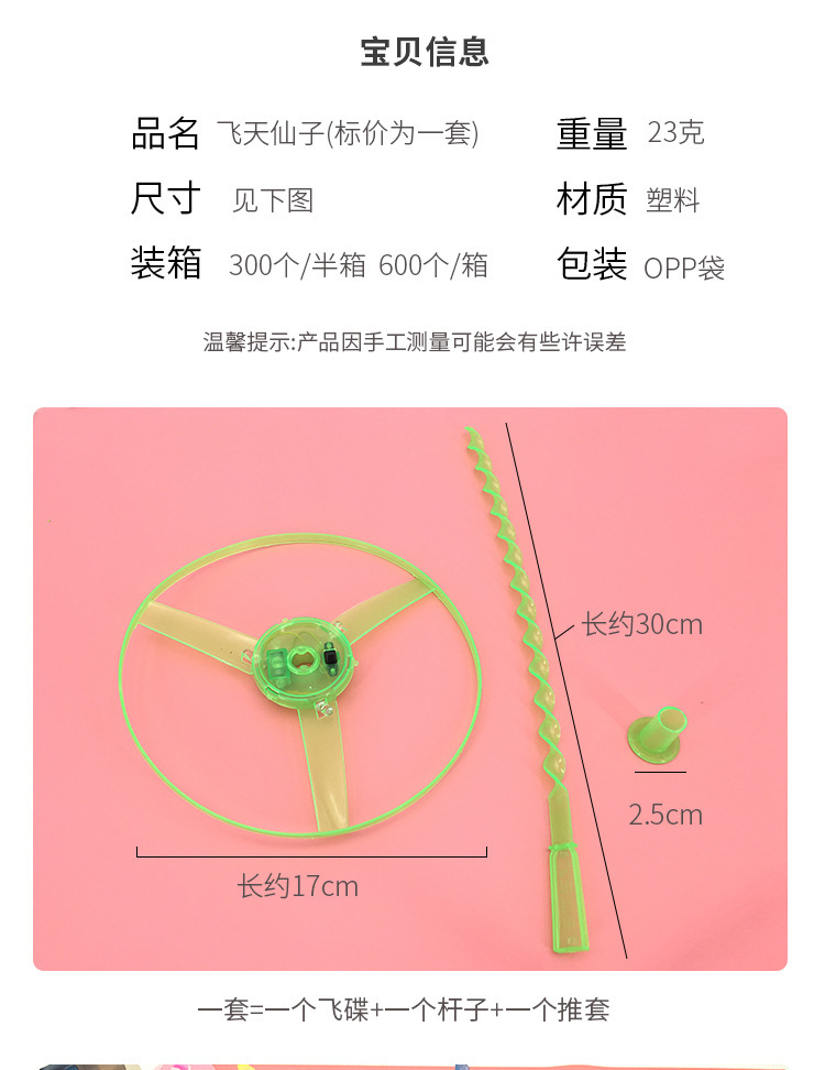 【使用方法】:把圆盘套进杆子到底端,用小圆圈一推,飕就发射啦,根据用力大小决定飞的高低,,爸爸妈妈和宝宝,小伙伴比比赛,看看谁飞的高。(操作简单 年龄大小 均适合)带电子款比较重没有不带飞的高,属于正常,不作为售后处理请知悉