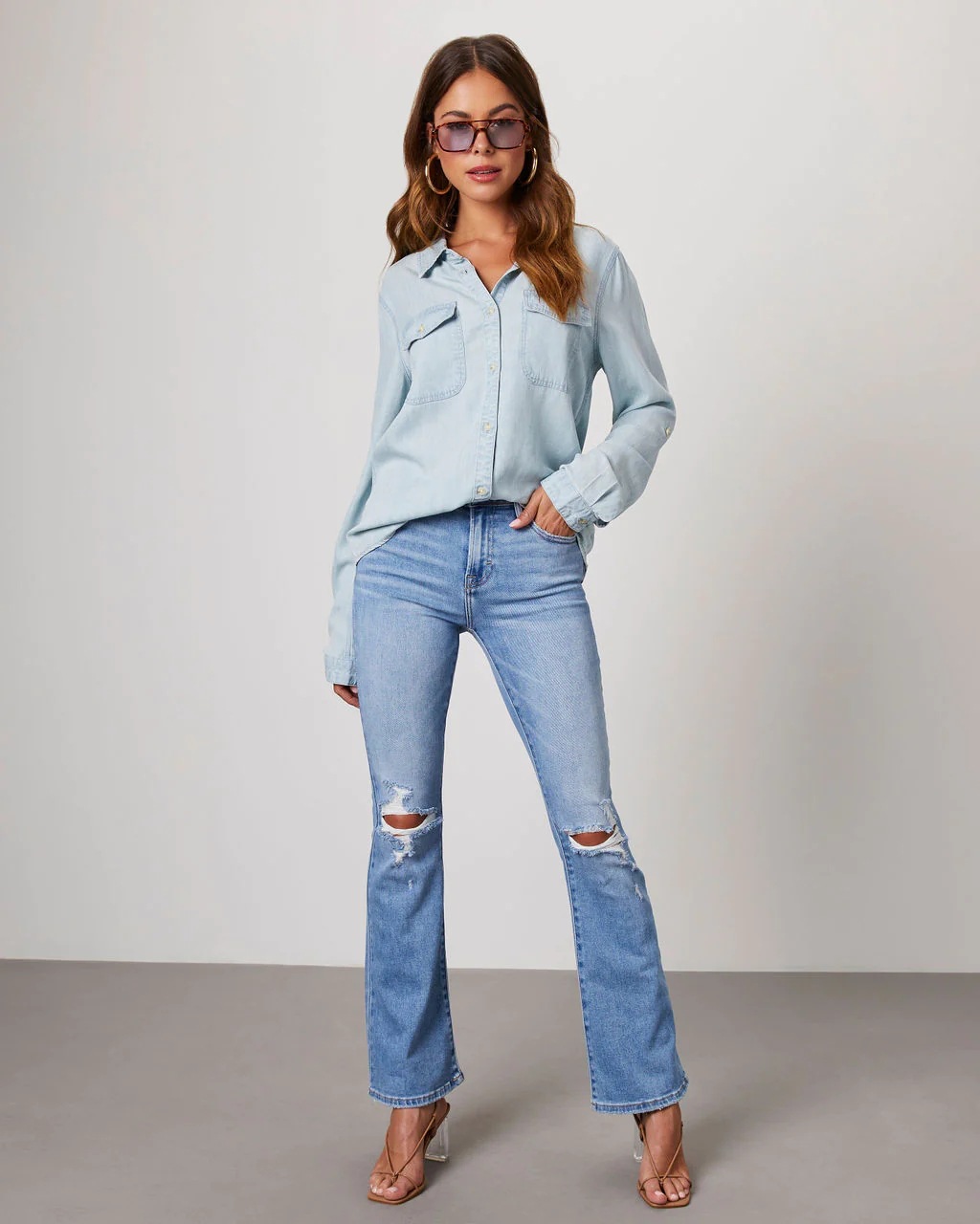 데님 셔츠 유럽과 미국의 국경 아마존 가을 캐주얼 옷깃 싱글 브레스트 여성 긴팔 데님 32130