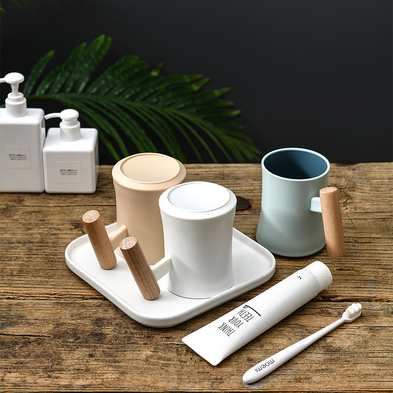 더블 레이어 대조 색상 구강 세척제 컵 나무 손잡이 크리에이티브 구강 세척제 컵 커플 칫솔 컵 고급 플라스틱 구강 세척제 컵