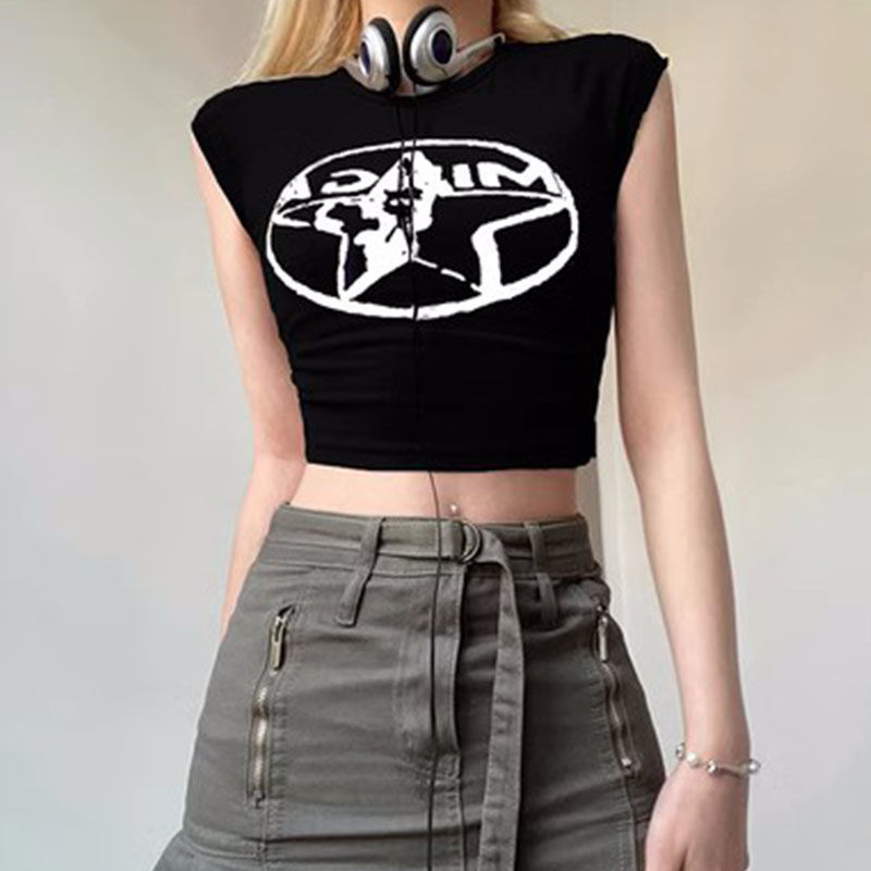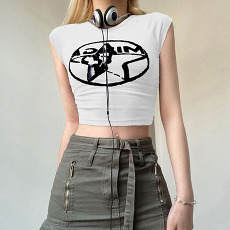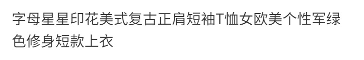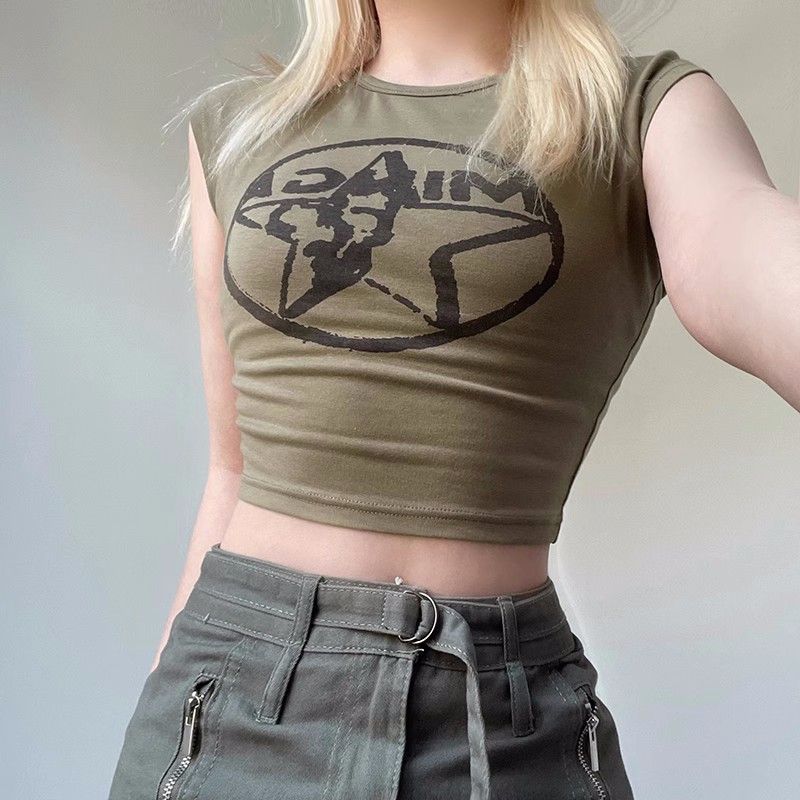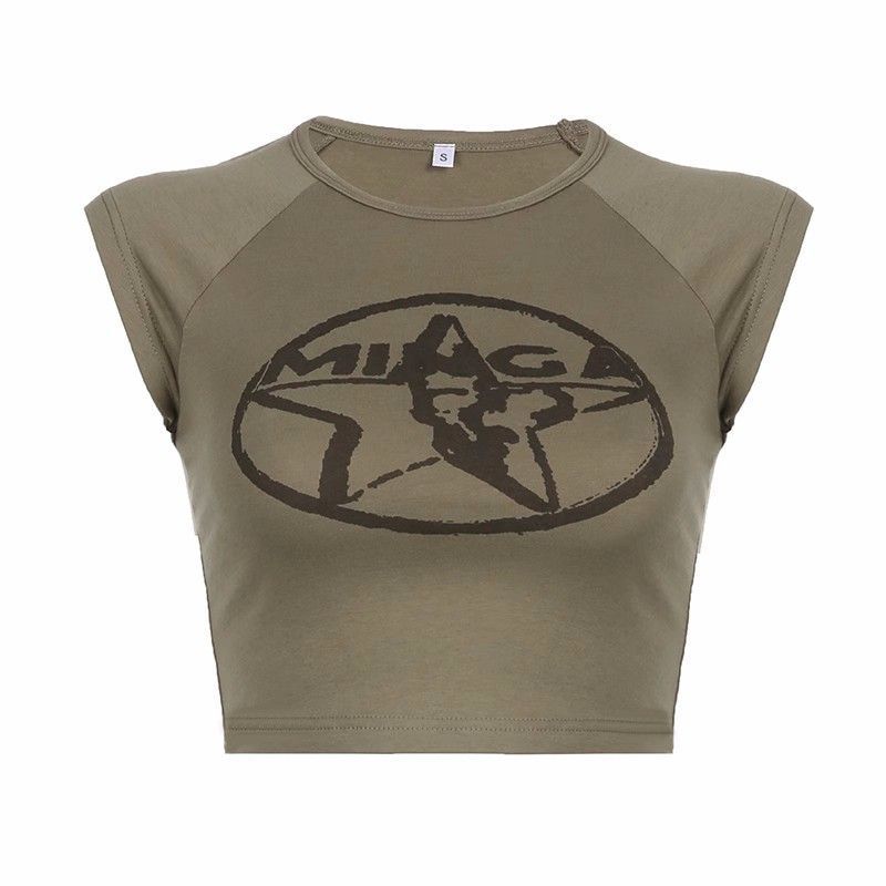 레터 스타 프린트 아메리칸 스타일 레트로 반팔 티셔츠 여성의 유럽과 미국 스타일 카키 슬림핏 짧은 탑