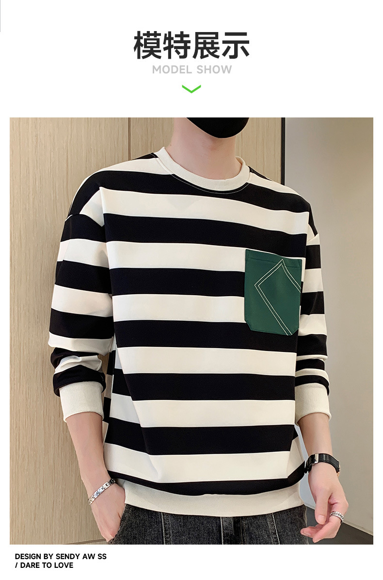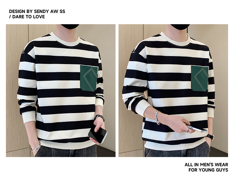 2023 봄과 가을 새로운 남성용 운동복 캐주얼 모든 경기 청소년 잘생긴 긴팔 티셔츠 라운드 넥 스트라이프 루즈한 코트스토어 가기