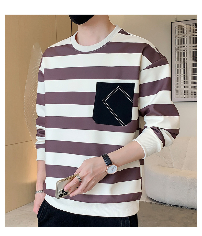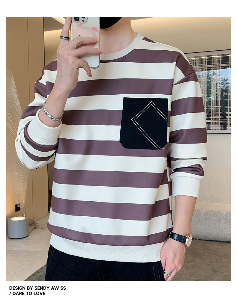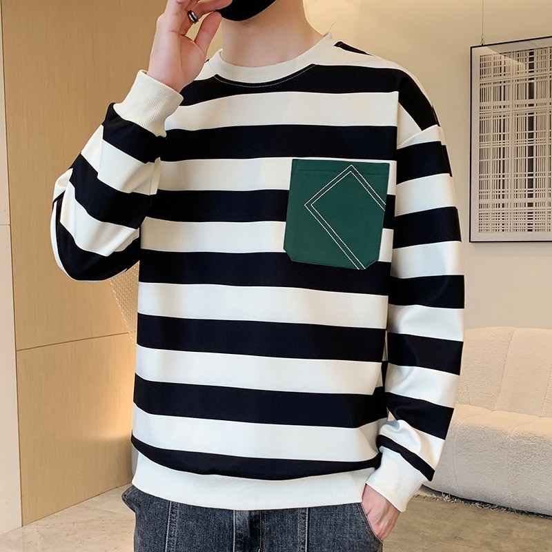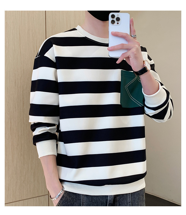 2023 봄과 가을 새로운 남성용 운동복 캐주얼 모든 경기 청소년 잘생긴 긴팔 티셔츠 라운드 넥 스트라이프 루즈한 코트