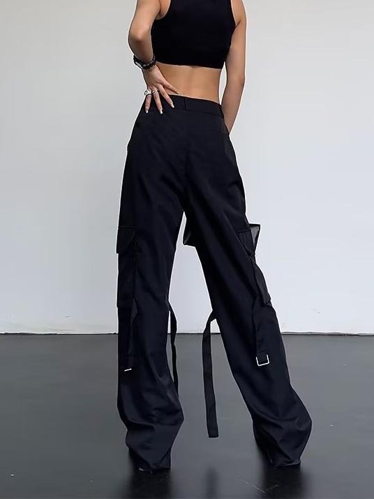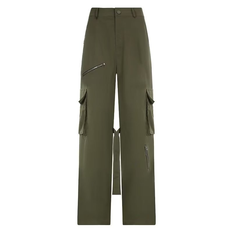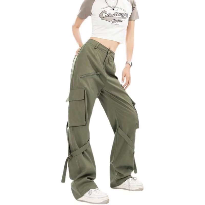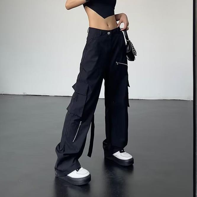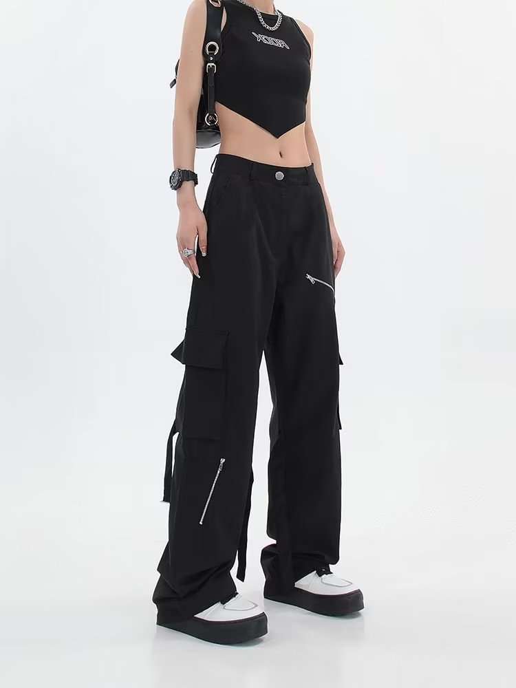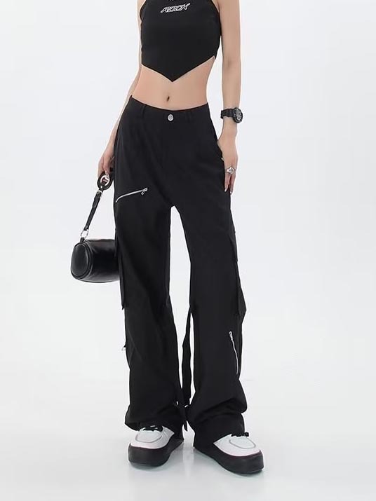 리본 지퍼 디자인 센스 작업복 캐주얼 바지 여성용 여름 러쉬 팬츠 트렌디 모든 매치 루즈한 스트레이트 와이드 팬츠