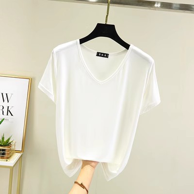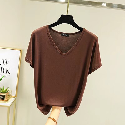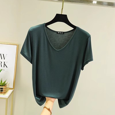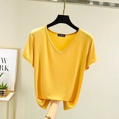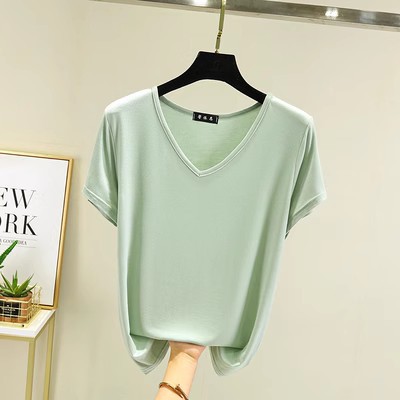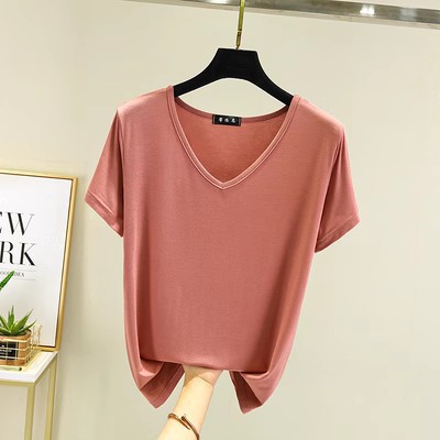 여름 단색 모달 V-넥 반팔 티셔츠 여성용 플러스 사이즈 이너베이스 셔츠 얇은 겉옷 한국 스타일 루즈한 탑스토어 가기