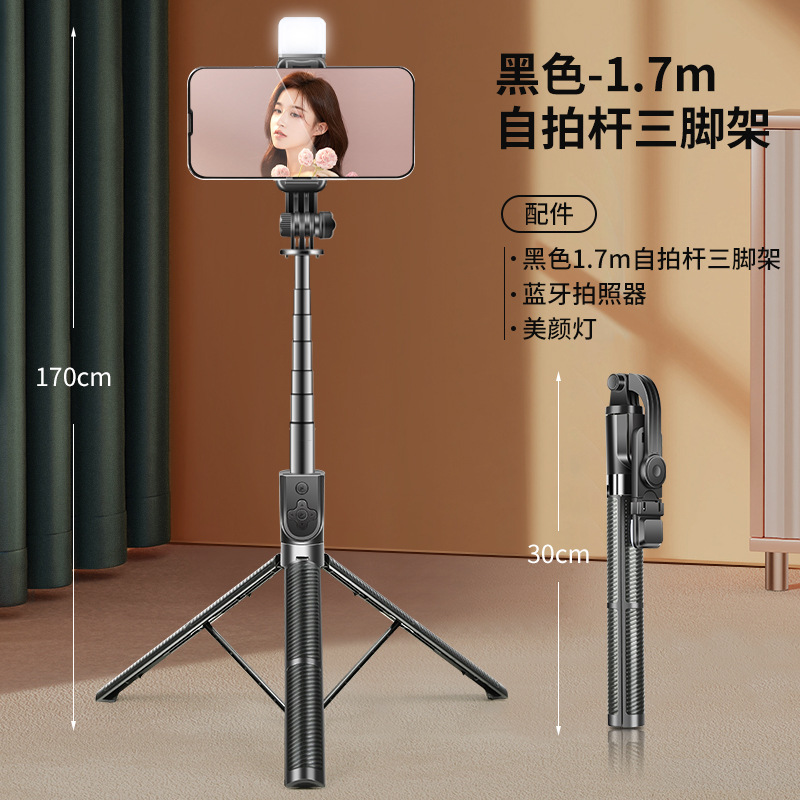 • [연장 1.7 m] 셀카 스틱 삼각대 블랙 + 뷰티 램프