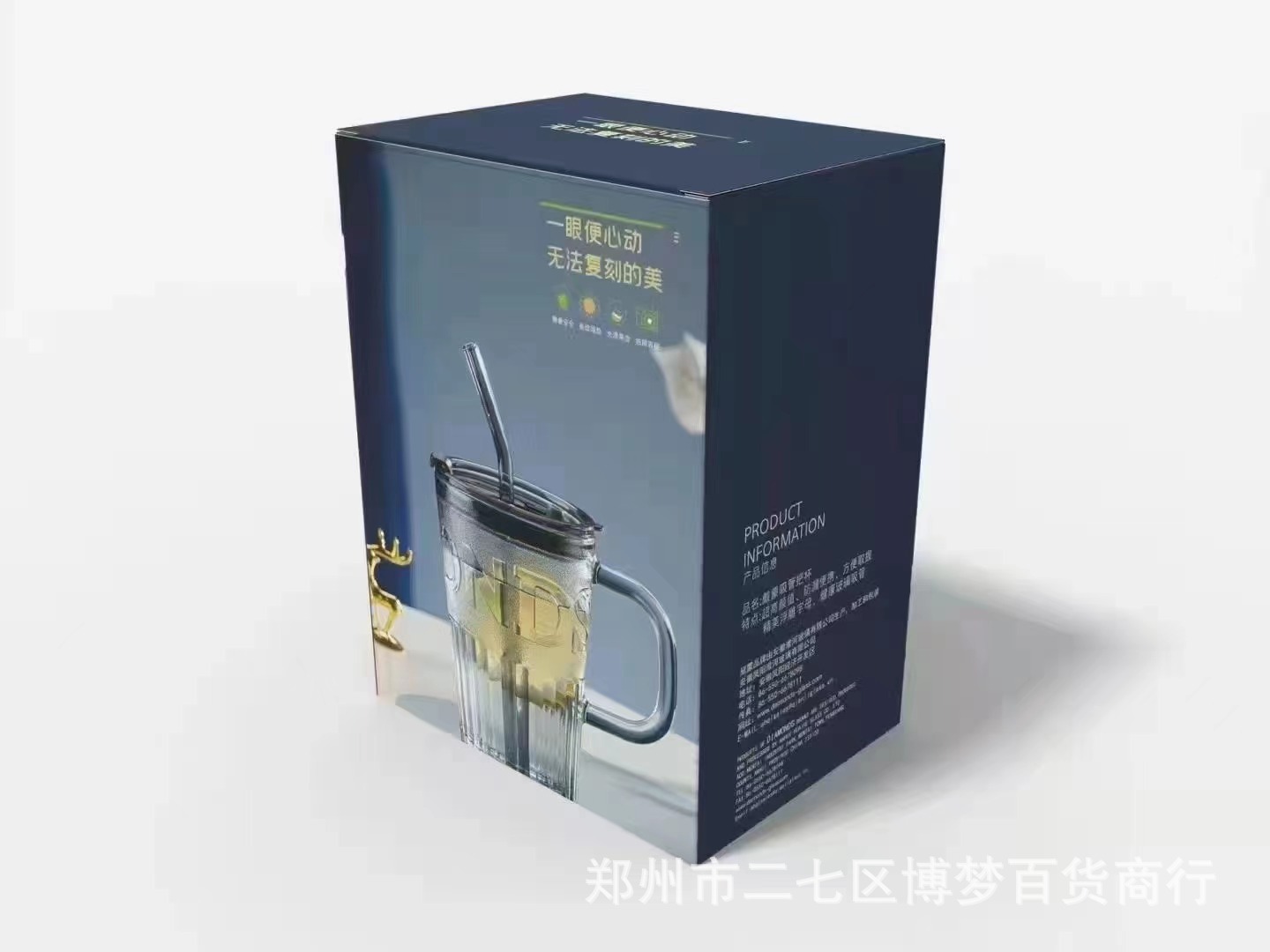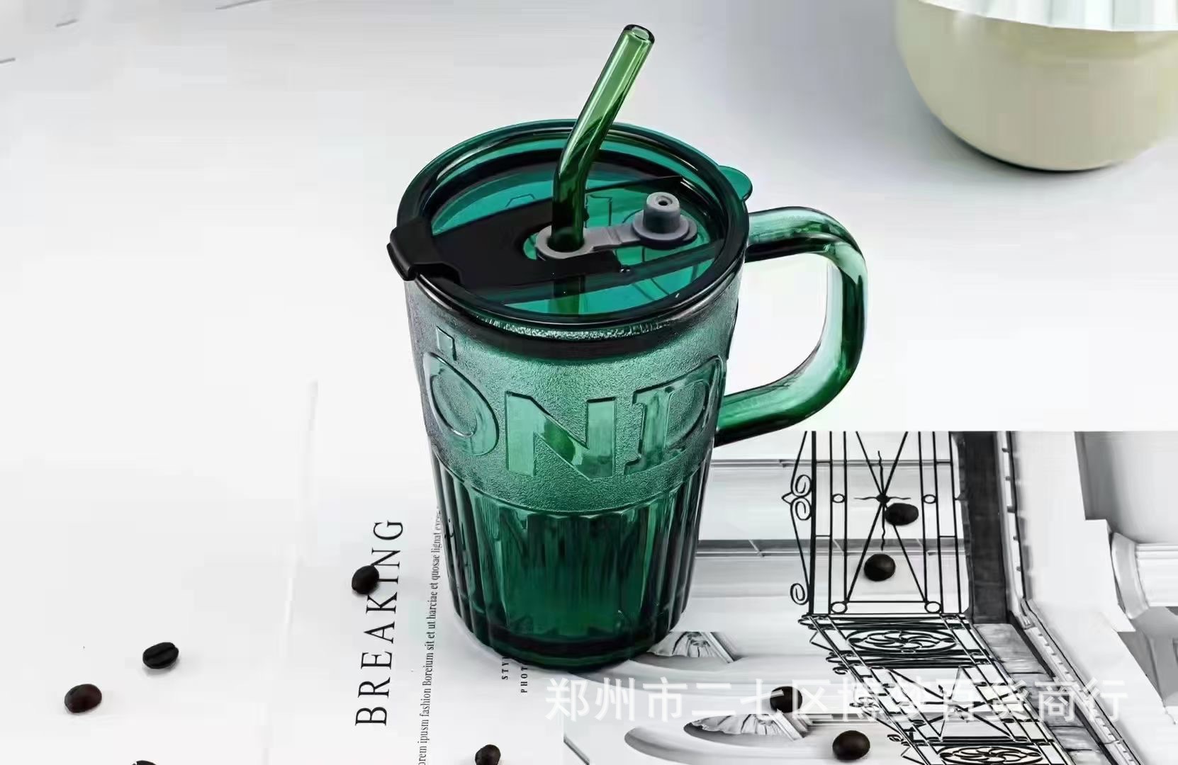 뚜껑이있는 스타일 유리 흡입 튜브 컵 에메랄드 연기 회색 마시는 컵 손잡이가있는 커피 우유 컵 높은 색상 값