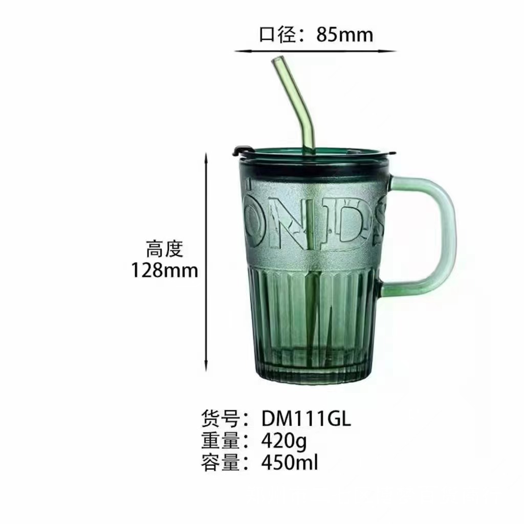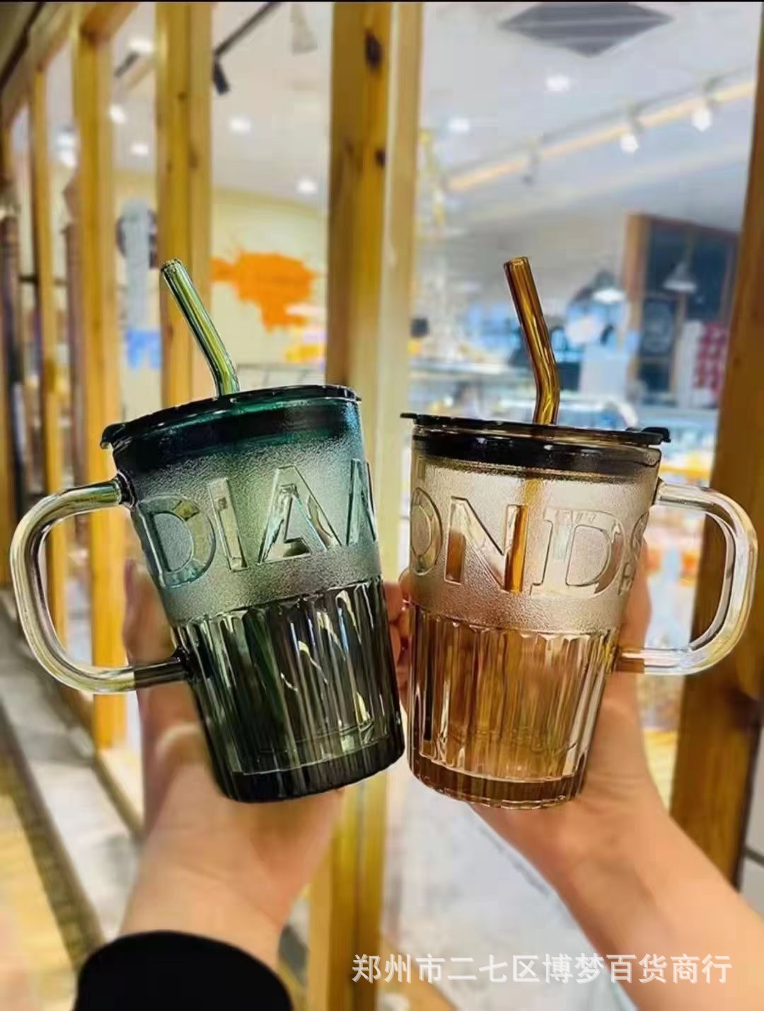 뚜껑이있는 스타일 유리 흡입 튜브 컵 에메랄드 연기 회색 마시는 컵 손잡이가있는 커피 우유 컵 높은 색상 값스토어 가기