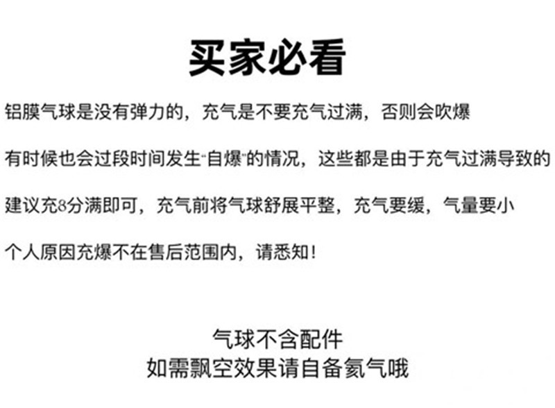 铝箔气球属于印刷品每包气球数量都是机器数数偶尔会有1到2个误差,并且可能会有3%左右的破损率,能接受的再拍,拍下的皆属于接受