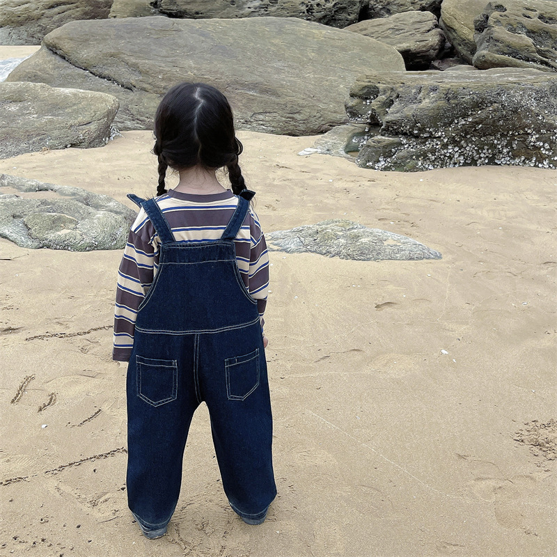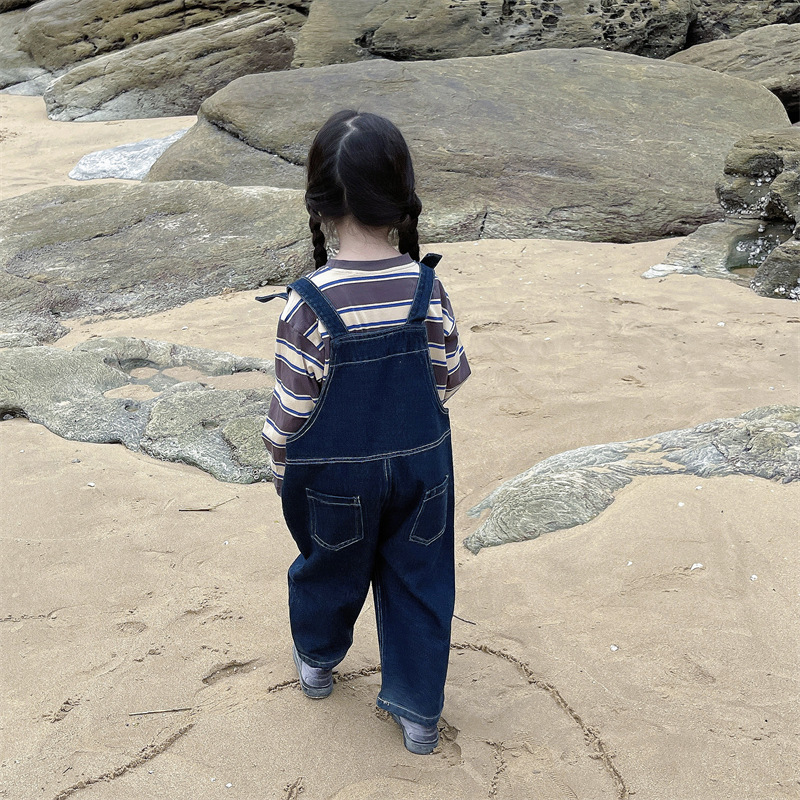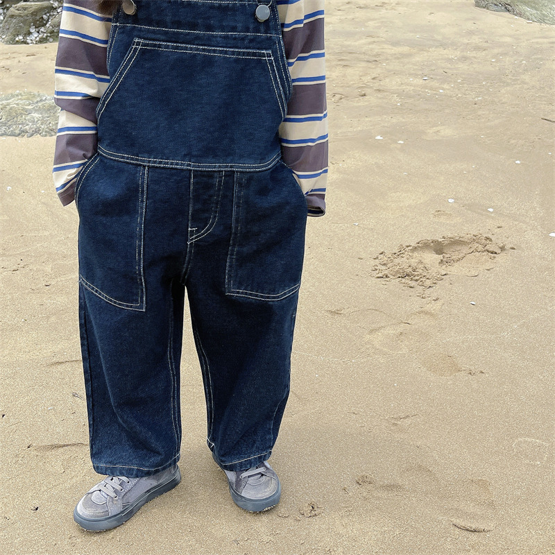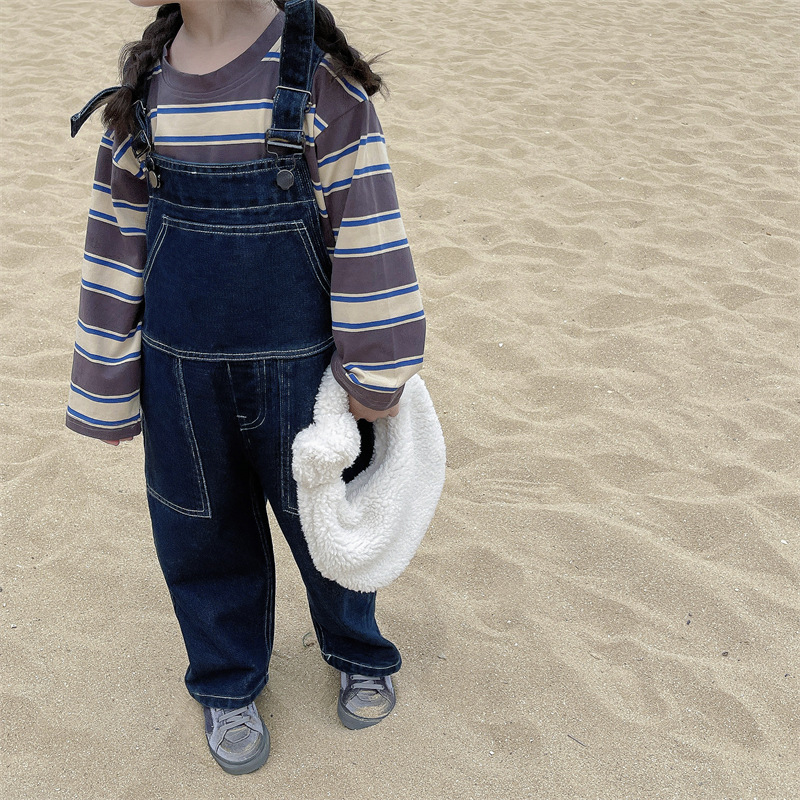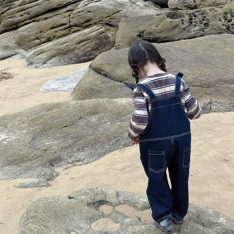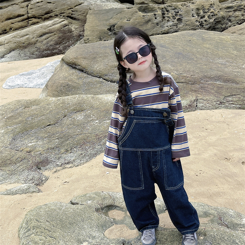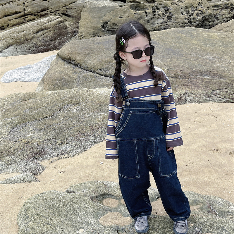 한국 아동복 2023 가을 유행 느슨한 데님 스트랩 와이드 레그 팬츠 소년과 소녀 + 다크 브라운 티셔츠 촬영 별도