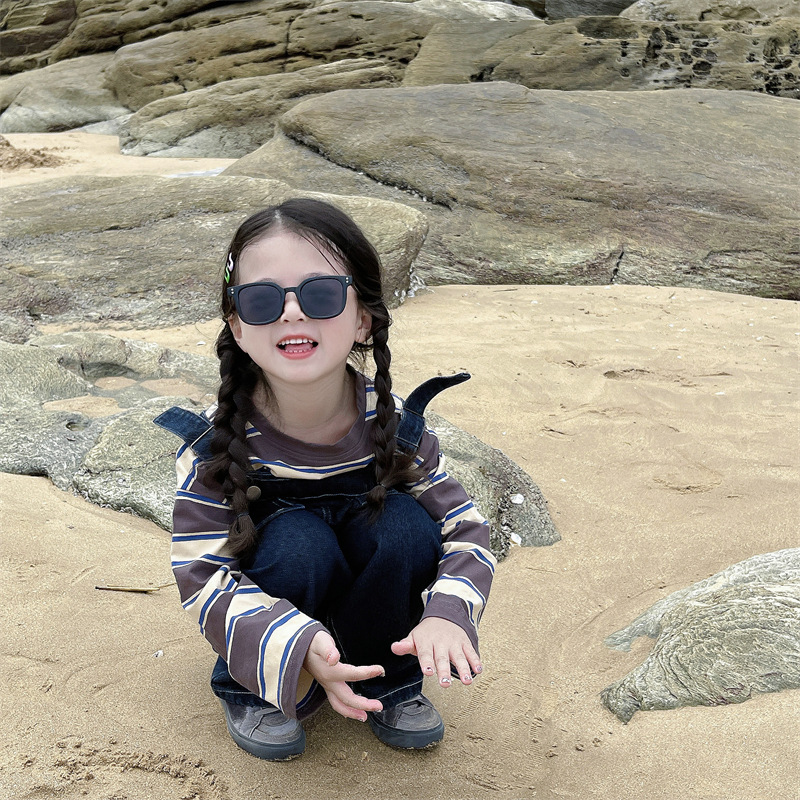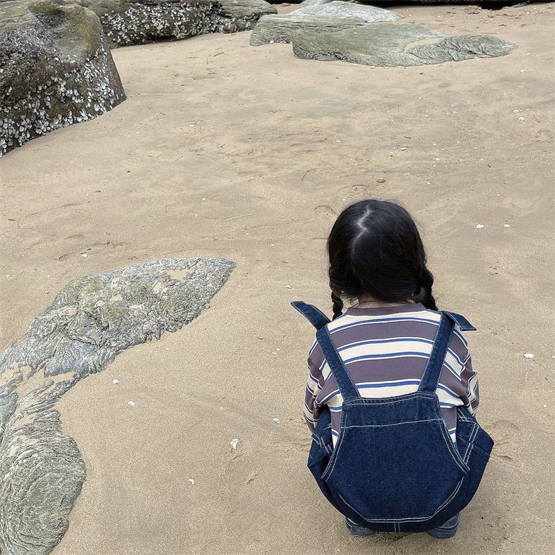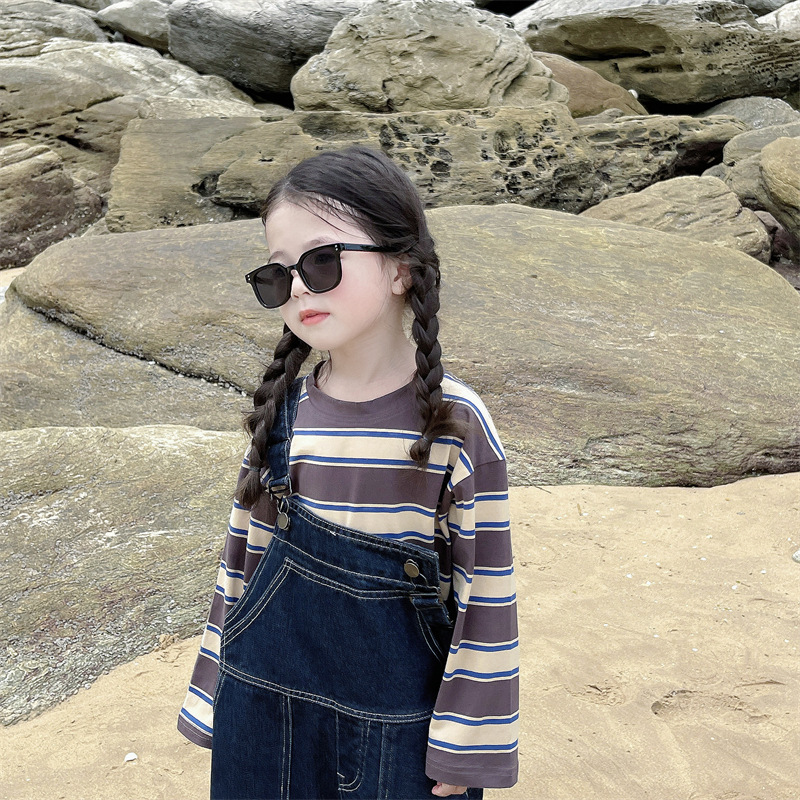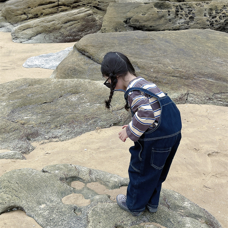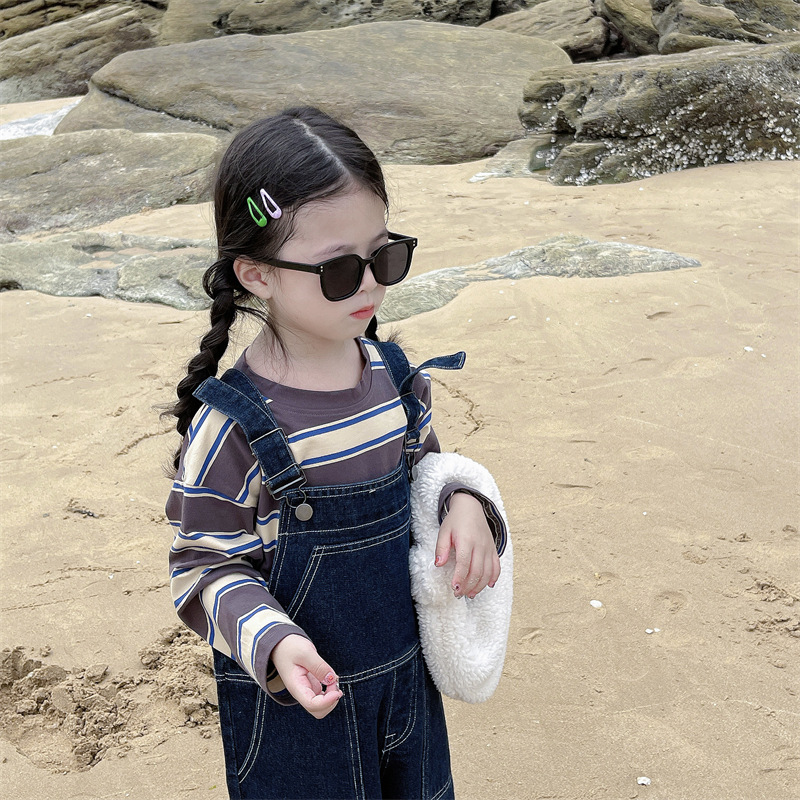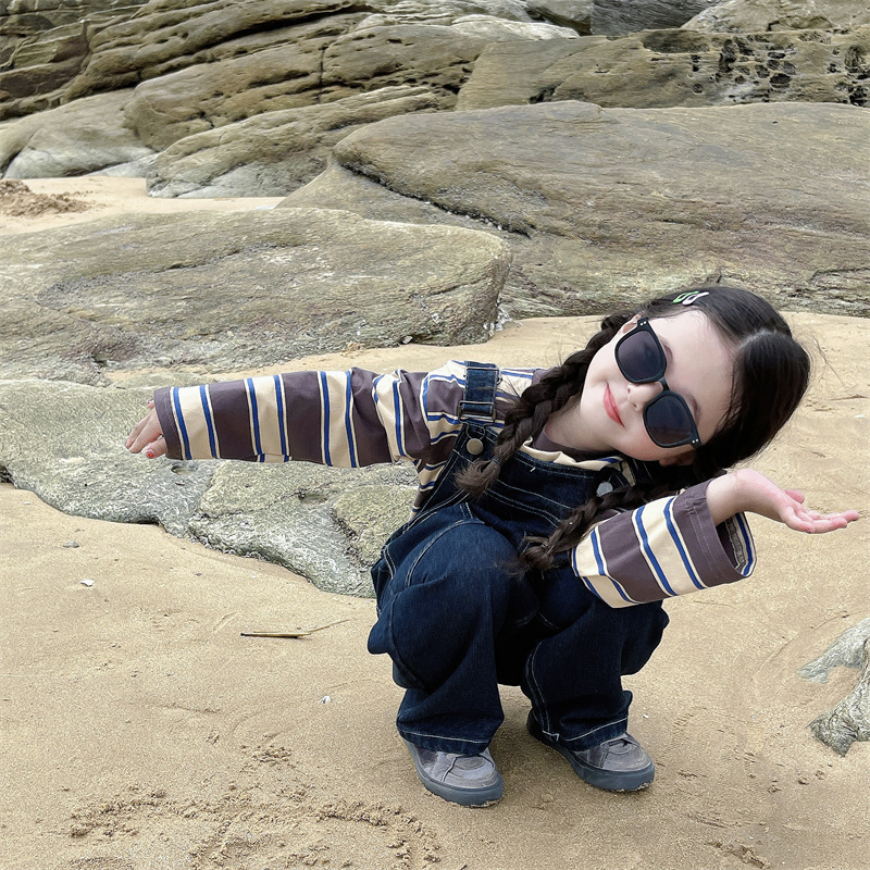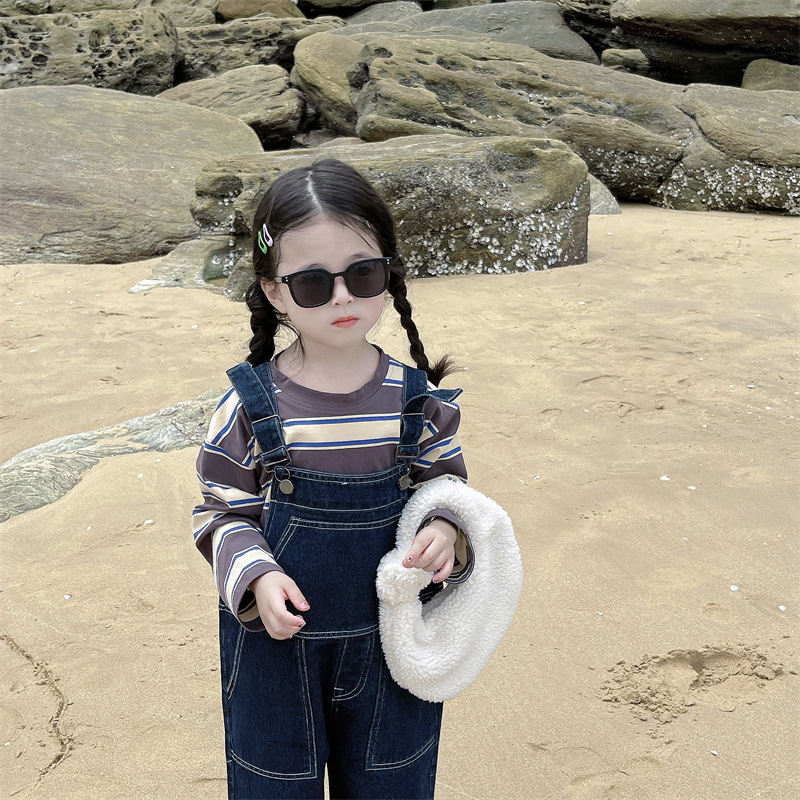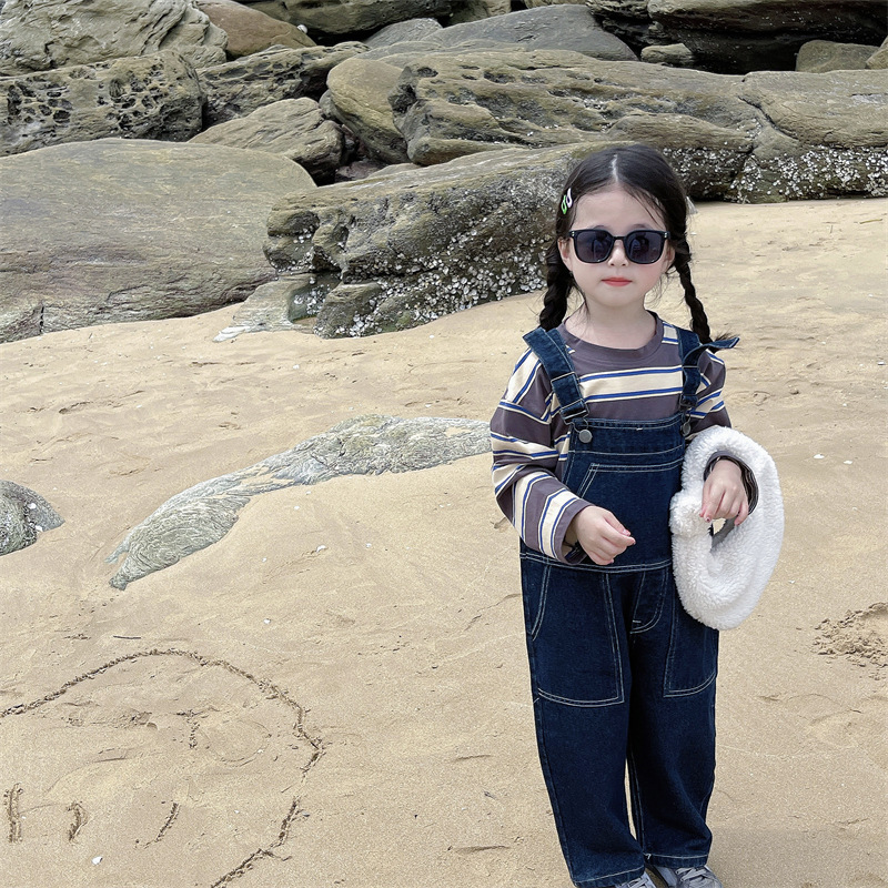 한국 아동복 2023 가을 유행 느슨한 데님 스트랩 와이드 레그 팬츠 소년과 소녀 + 다크 브라운 티셔츠 촬영 별도