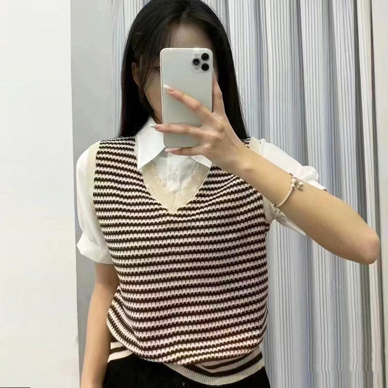 2023 여름 새로운 디자인 센스 가짜 투피스 셔츠 여성용 틈새 시크 폴로 칼라 스트라이프 니트 베이스 셔츠스토어 가기