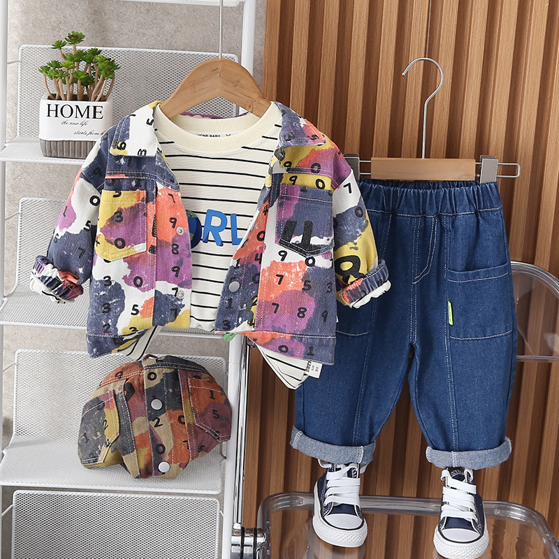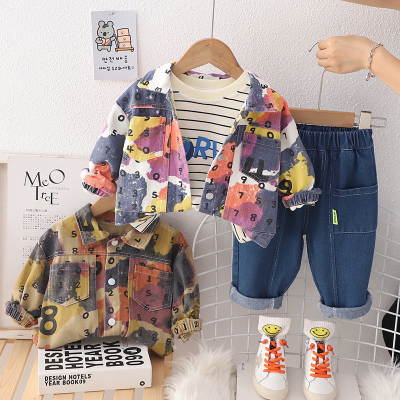 2023 어린이 가을 세트 아라비아 숫자 3 세트 소년 승무원 넥 셔츠 바지 제조 업체 도매