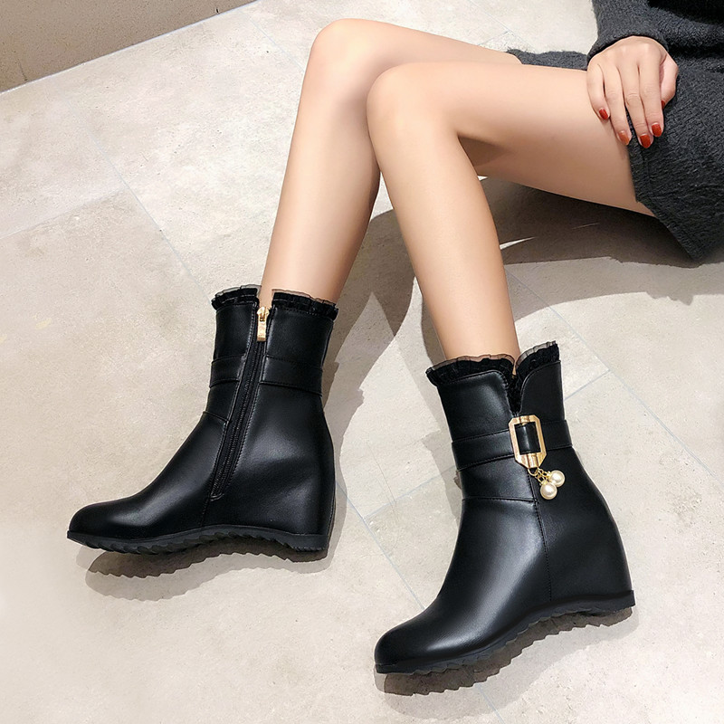 2023 새로운 레이스 달콤한 대학 스타일 여성 신발 유행 내부 높이 증가 발목 부츠 플러스 사이즈 미드 힐 사이버 연예인 마틴 부츠스토어 가기