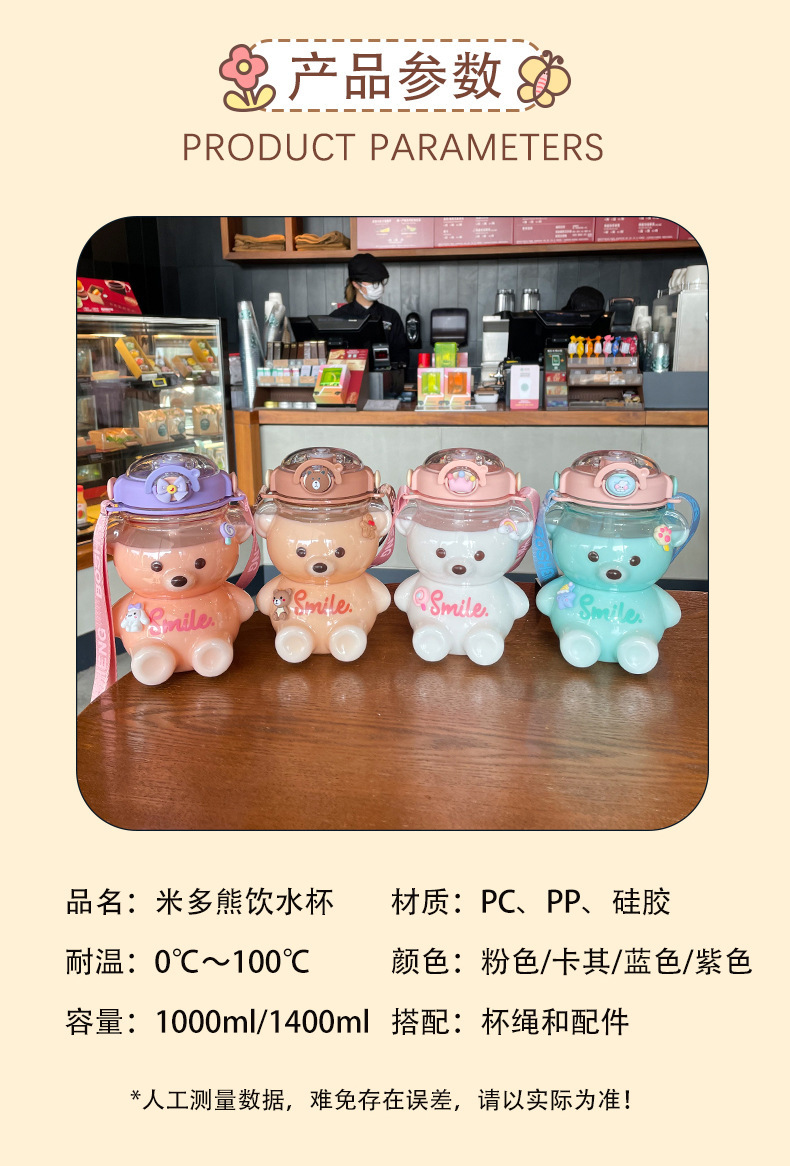 소녀를위한 곰 물 컵 여름 대용량 밀짚 플라스틱 컵 높은 찾고 주전자 휴대용 귀여운 어린이 물병