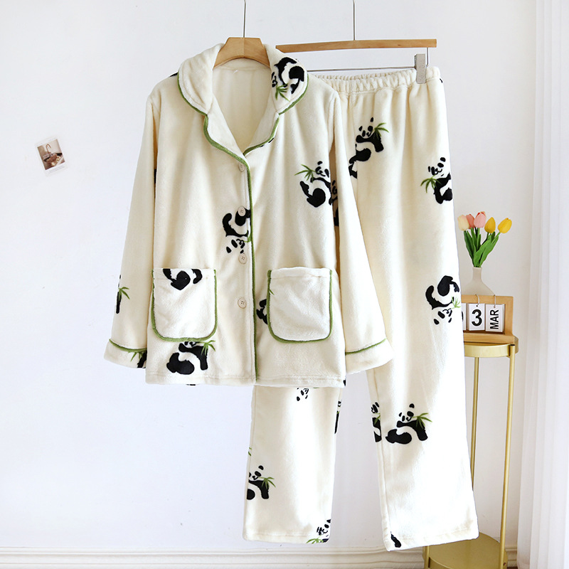 가을과 겨울 새로운 플란넬 커플 잠옷 긴 소매 바지 인쇄 여자의 Guofeng 팬더 홈 의류 남자의 세트