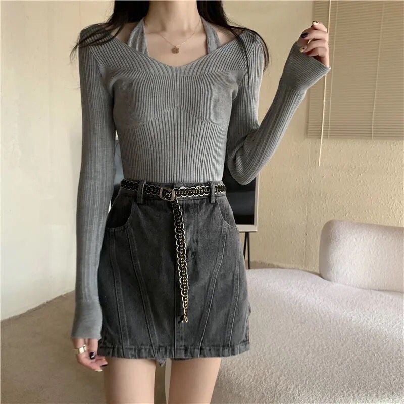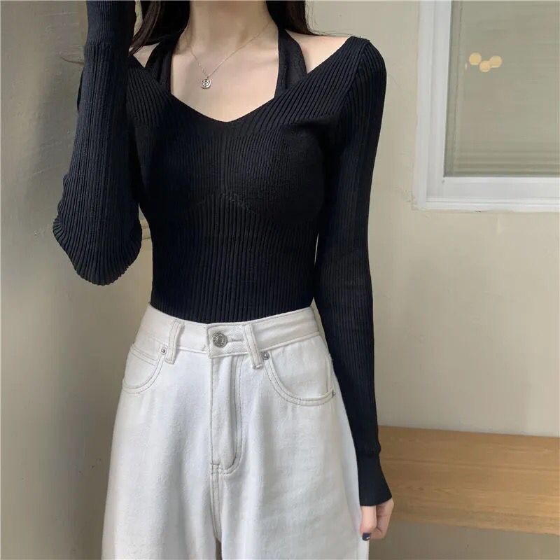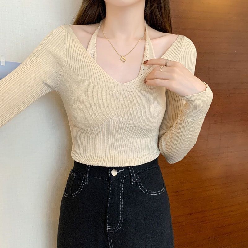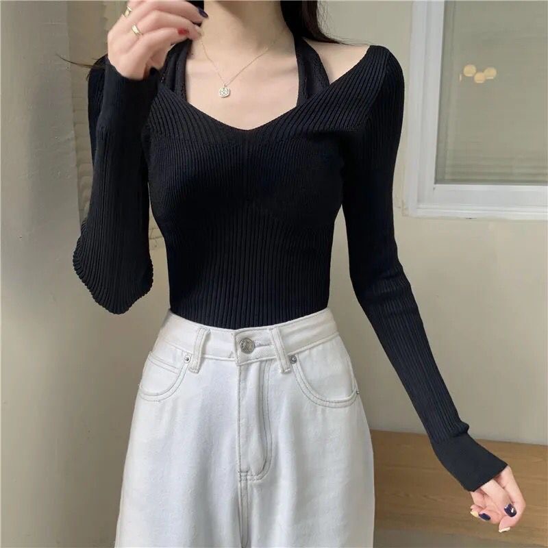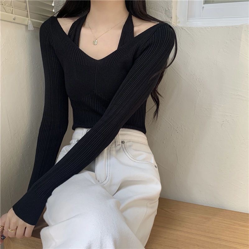 가을 새로운 스타일 섹시한 레이스 업 섹시한 쇄골 얇은 니트 셔츠 여성용 이너웨어 겉옷 슬림핏 긴팔 탑스토어 가기