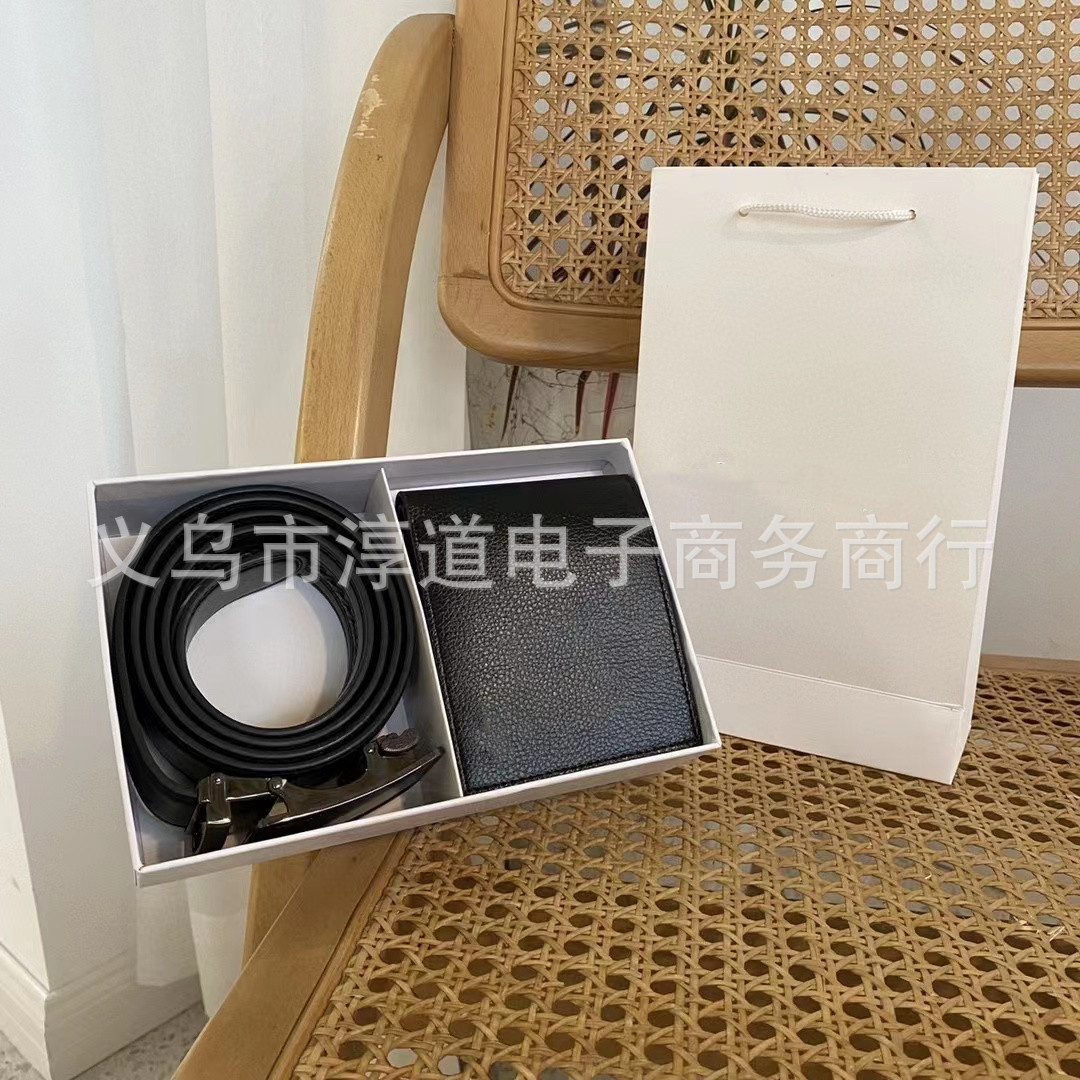 피쉬 월렛 가죽 벨트 세트 자동 버클 남성용 벨트 선물세트 골드 버클 블랙 인조 소가죽 벨트