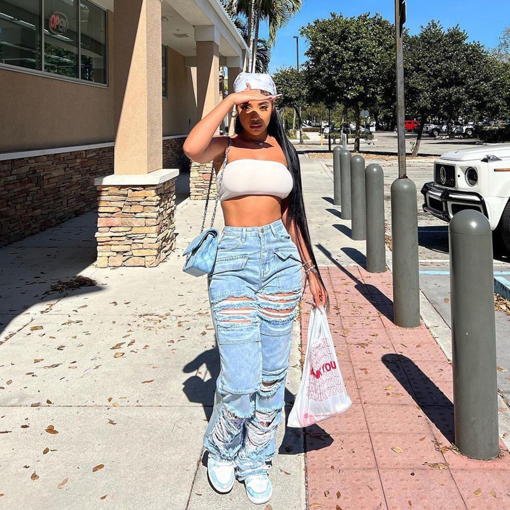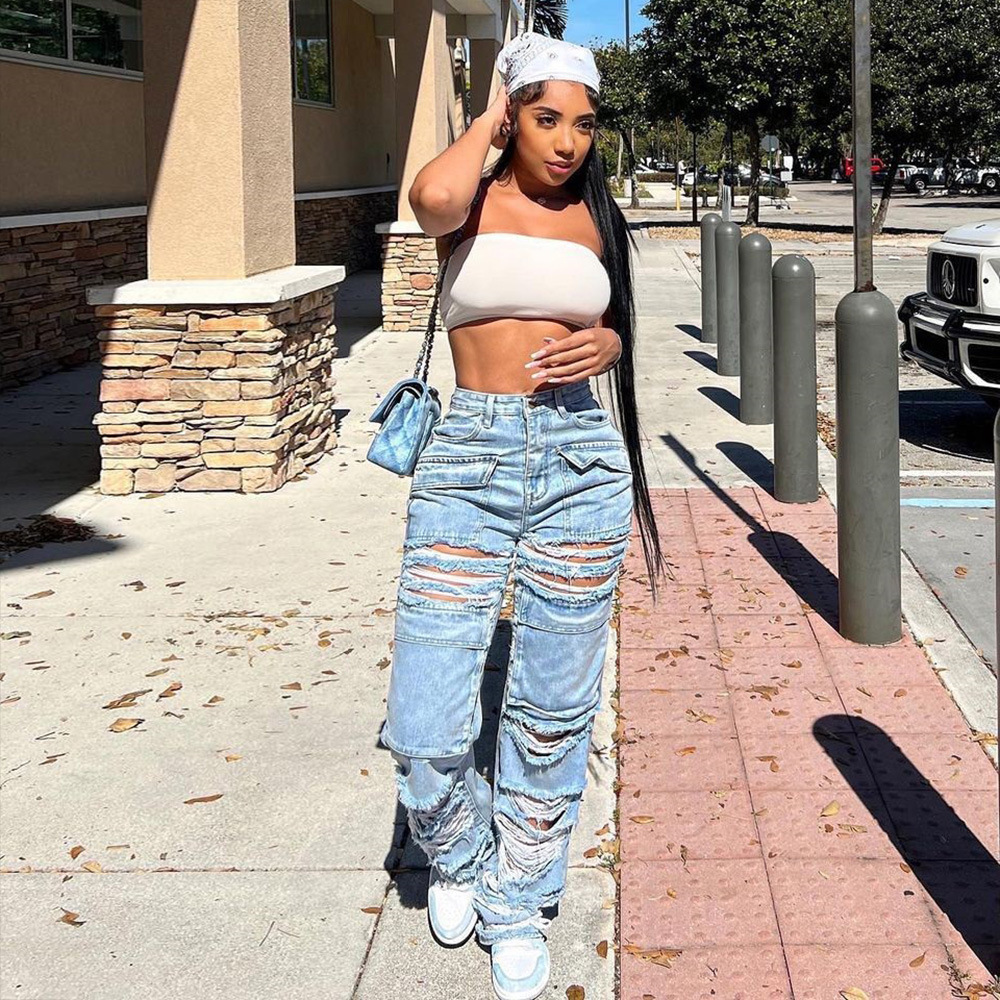 스트리트 캐주얼 찢어진 청바지 2023 새로운 필통 스트레이트 하이 웨이스트 와이드 레그 스트레이트 팬츠 공장 콘센트