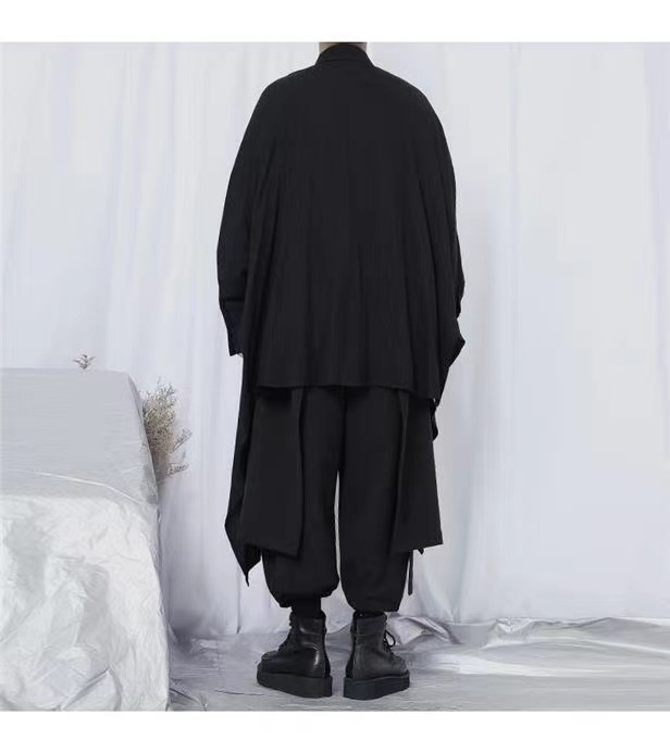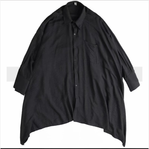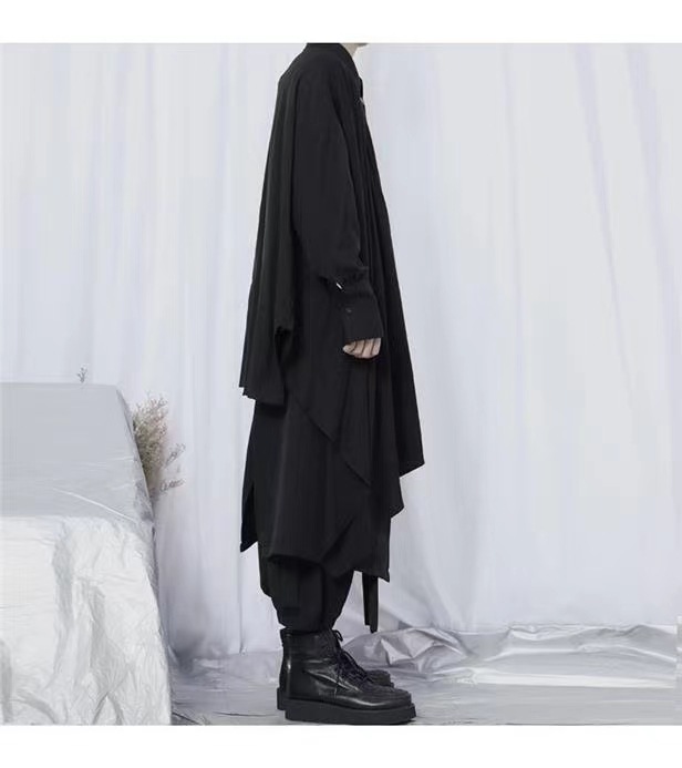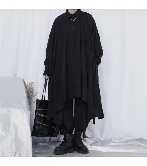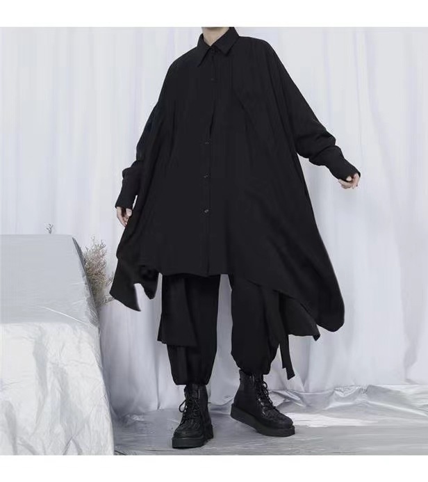 야마모토 스타일 다크 스타일 비대칭 디자인 감각 무거운 불규칙한 긴 소매 큰 셔츠 느슨한 플러스 사이즈 남성과 여성을위한 남성복