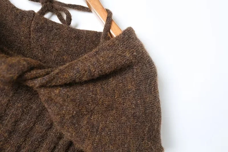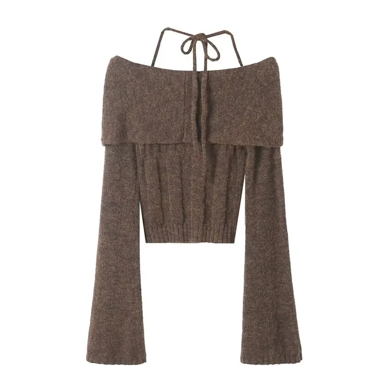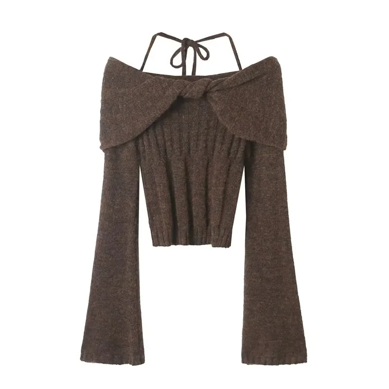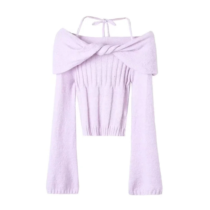 순수한 욕망 스타일 꼬임 오프 숄더 넥 니트 스웨터 가을 새로운 슬림 핏 트럼펫 슬리브 향신료 소녀 풀오버 스웨터