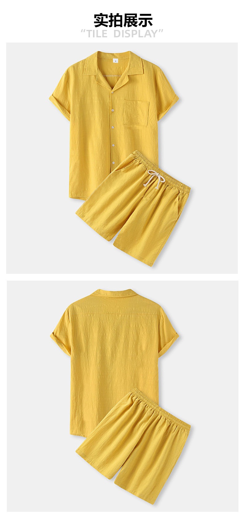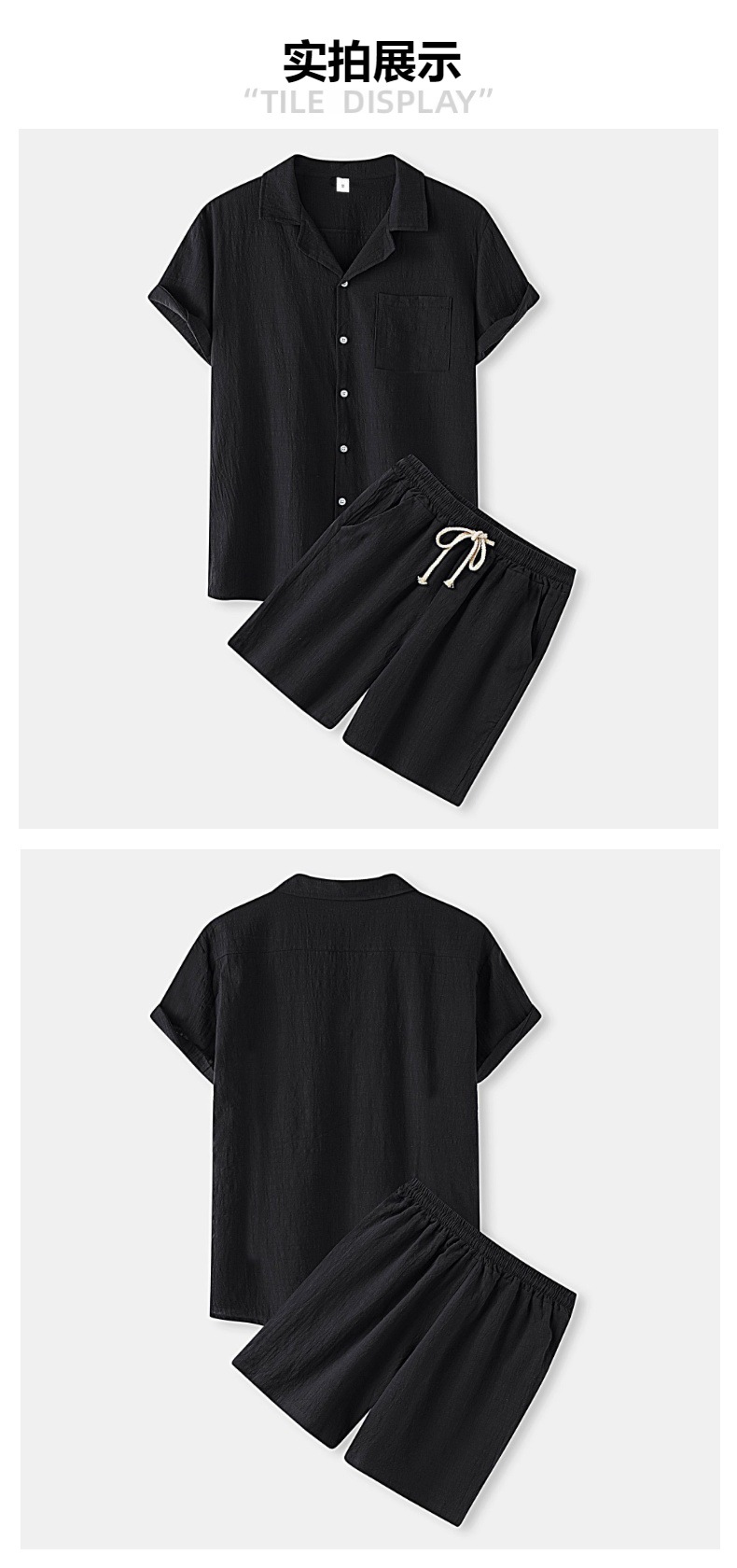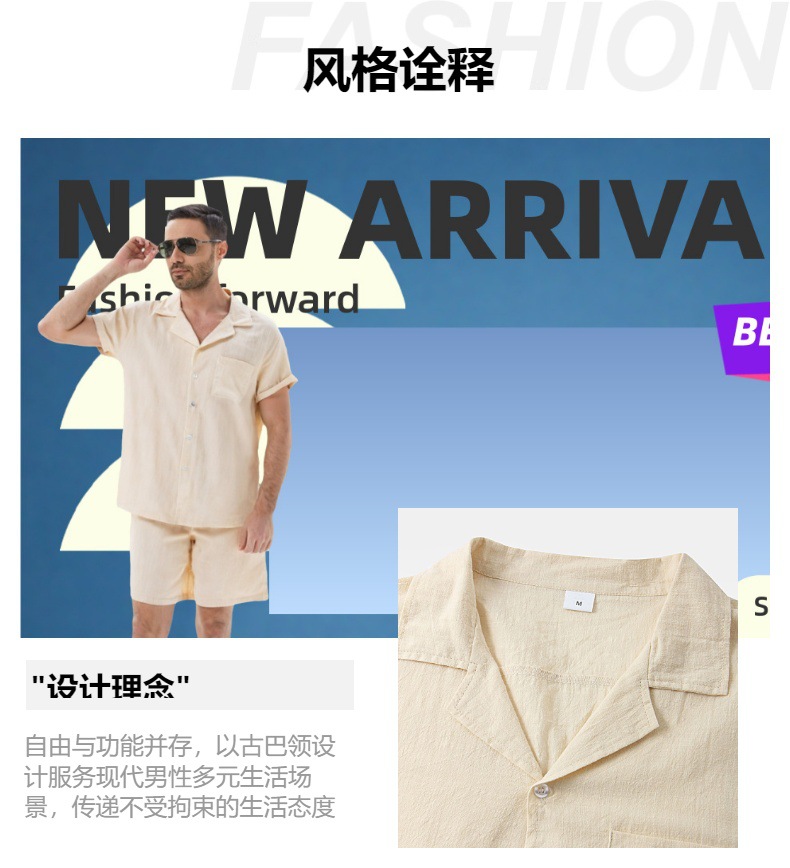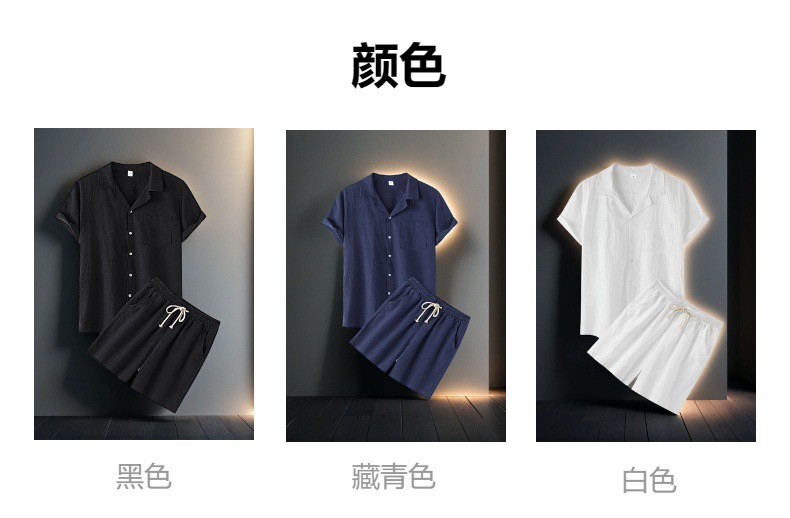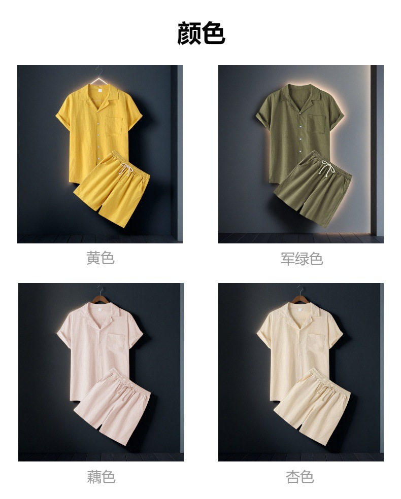 아마존 크로스 보더 남성 코튼 솔리드 컬러 하와이 패션 옷깃 반팔 셔츠 반바지 정장 투피스 세트스토어 가기