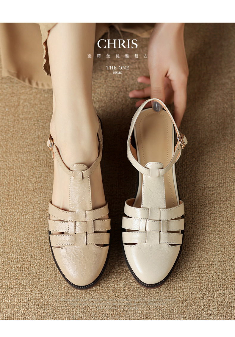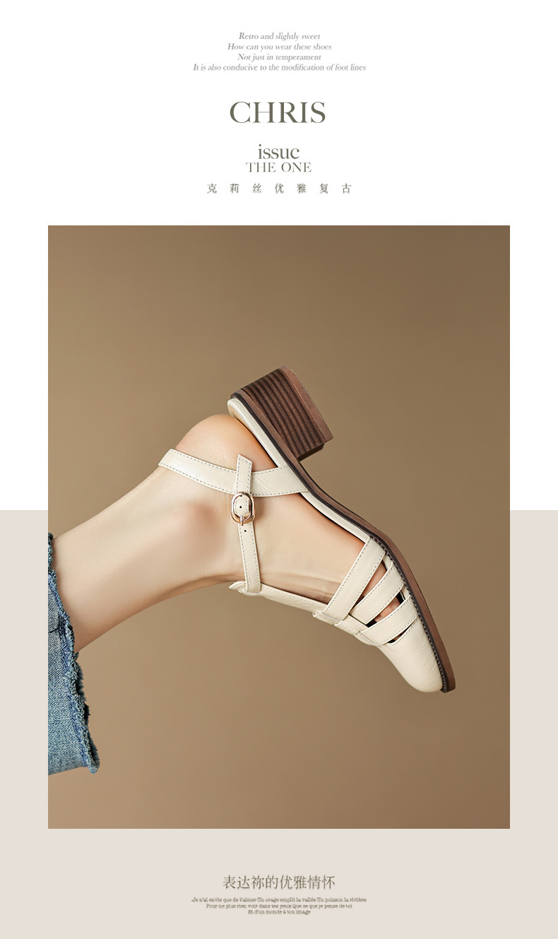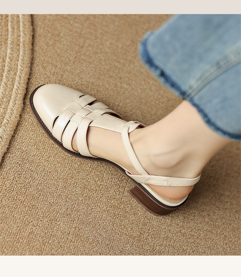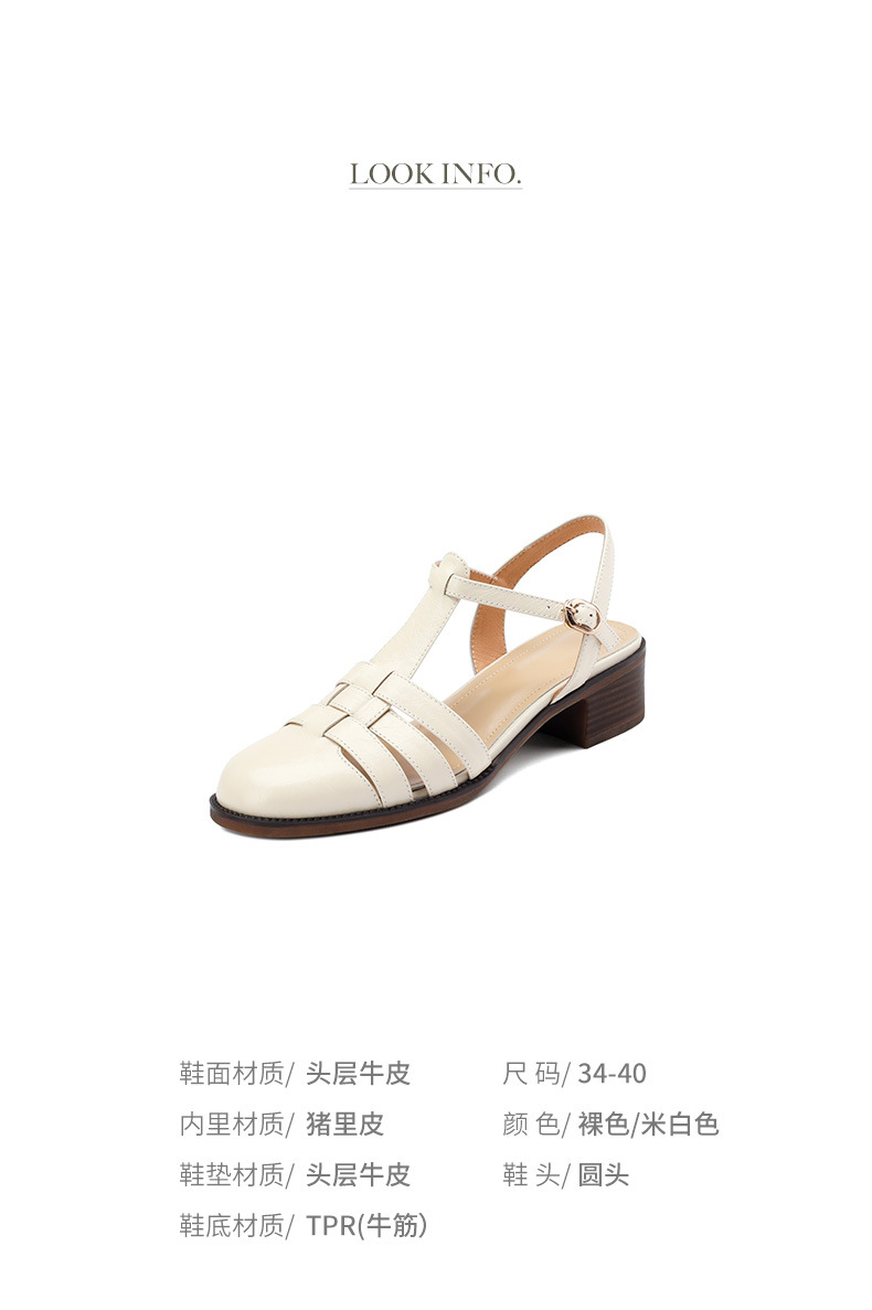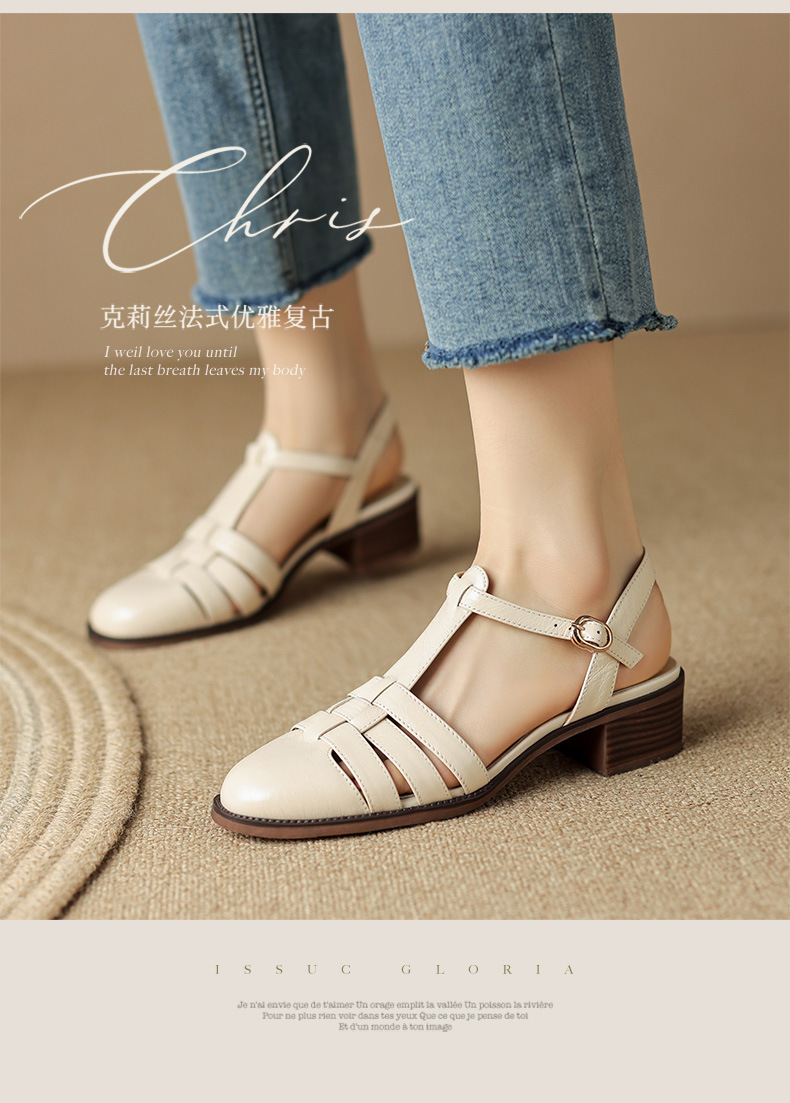 Yue Laiya ~ 빈티지 짠 Baotou 로마 샌들 여성용 두꺼운 굽 2023 여름 새로운 정품 가죽 미들 힐 돼지 케이지 신발