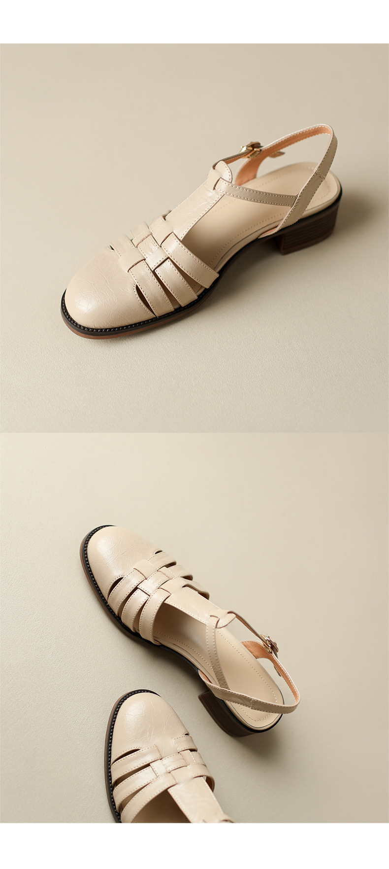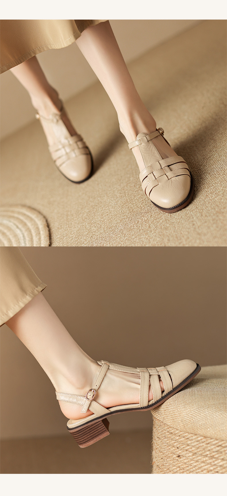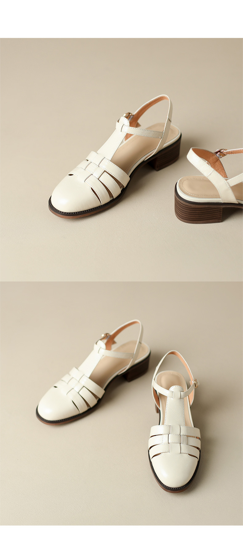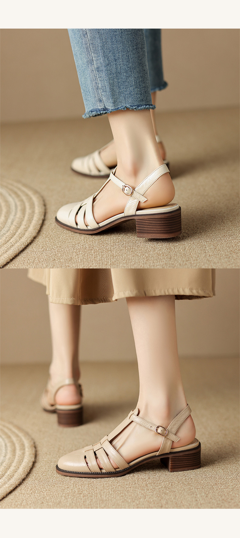 Yue Laiya ~ 빈티지 짠 Baotou 로마 샌들 여성용 두꺼운 굽 2023 여름 새로운 정품 가죽 미들 힐 돼지 케이지 신발