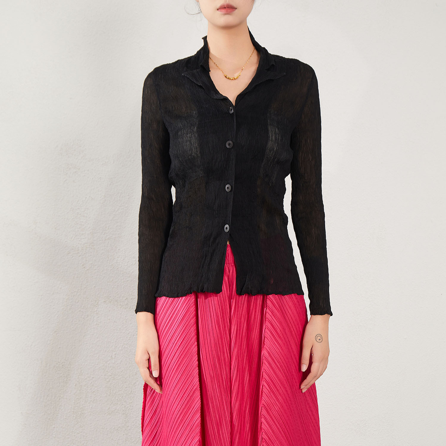 블랙 긴팔 쉬폰 셔츠 여성용 봄 가을 2026 신상 미야케 스타일 루즈핏 큰 사이즈 슬리밍 V넥 탑스토어 가기