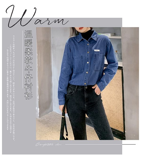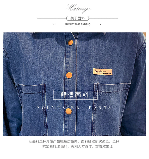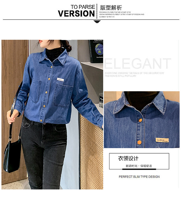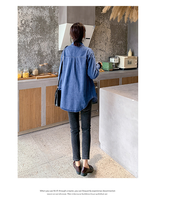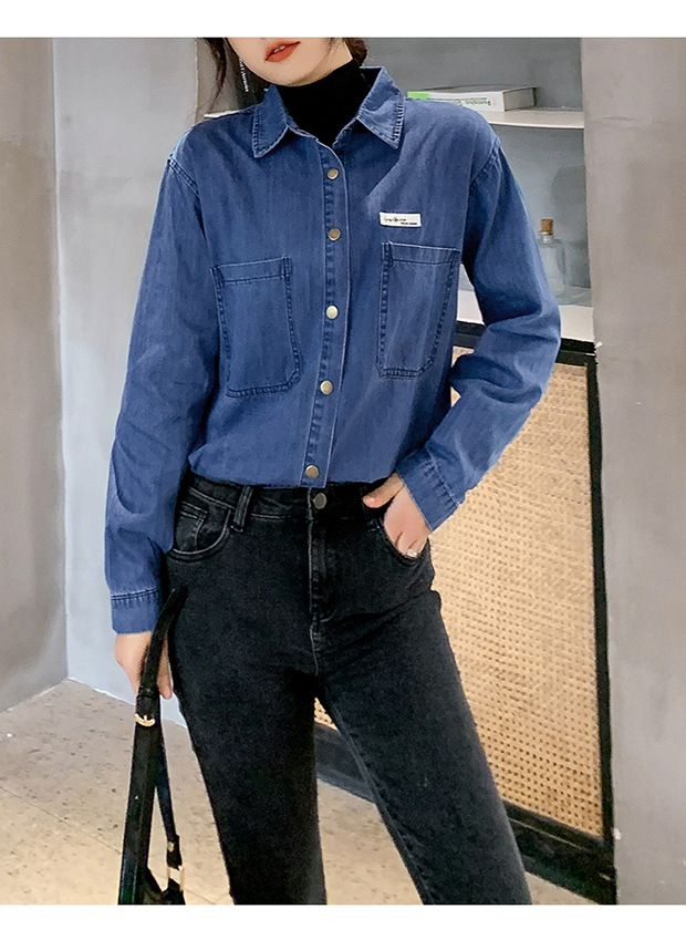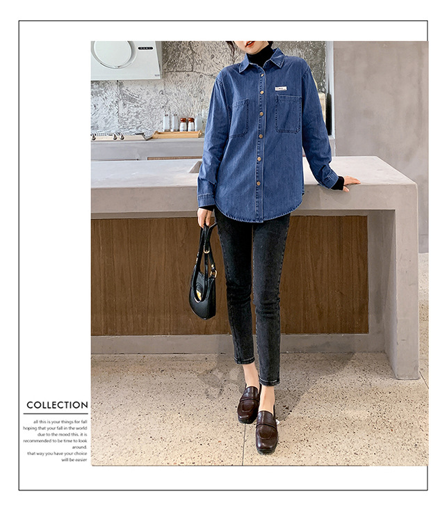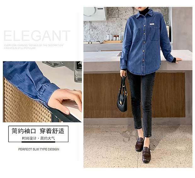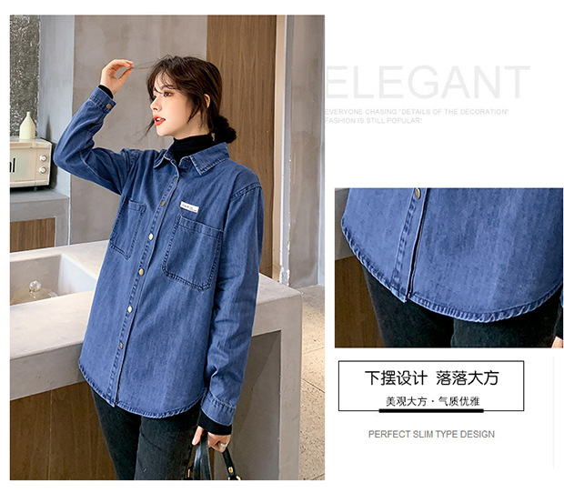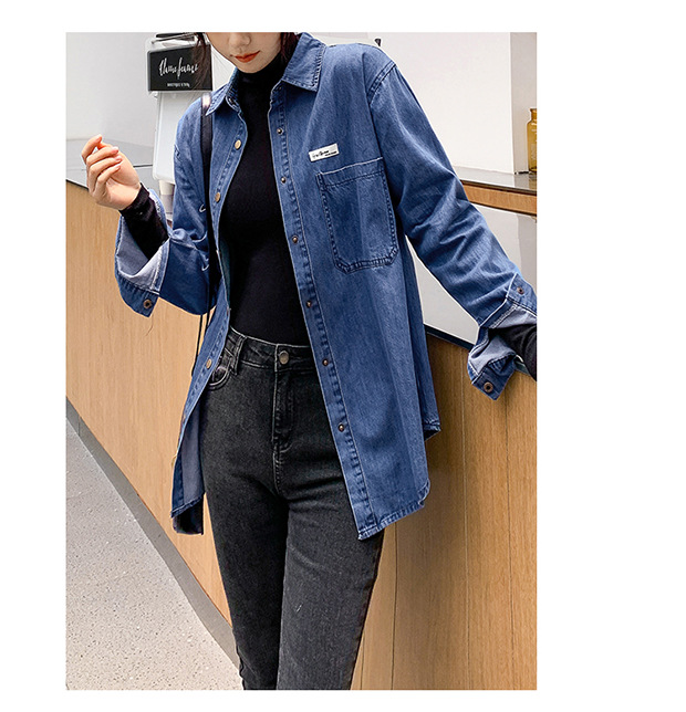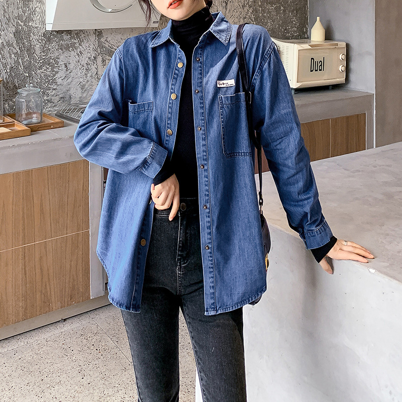 느슨한 캐주얼 BF 바람 긴 소매 데님 셔츠 여자의 더블 포켓 화이트 라벨 긴 셔츠 코트 여자의 세대