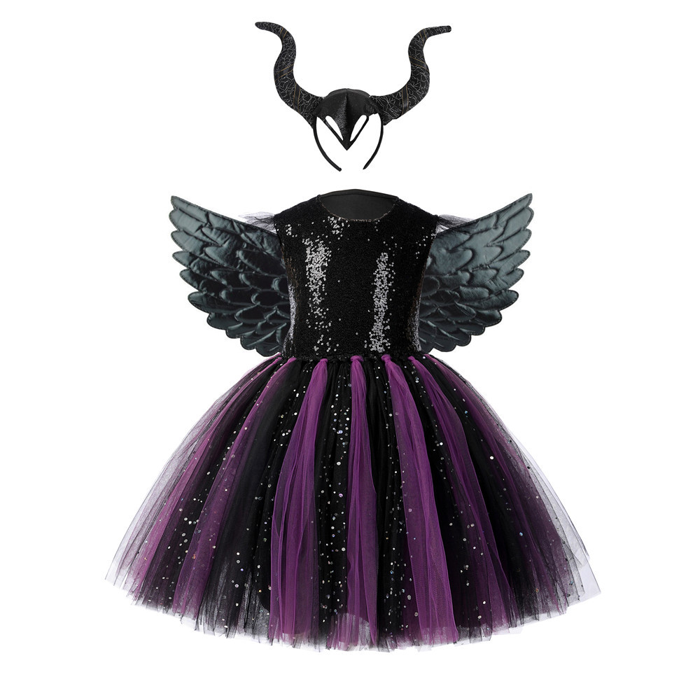 아마존 할로윈 잠자는 숲속의 여왕 마녀 악마 코스프레 어린이 공연 의상 소녀용 검은색 망사 드레스
