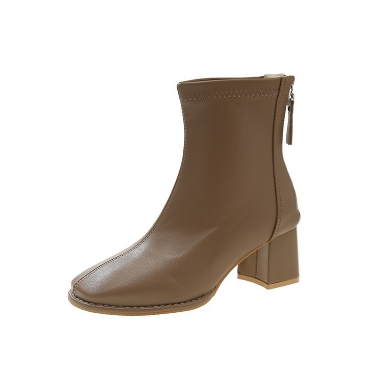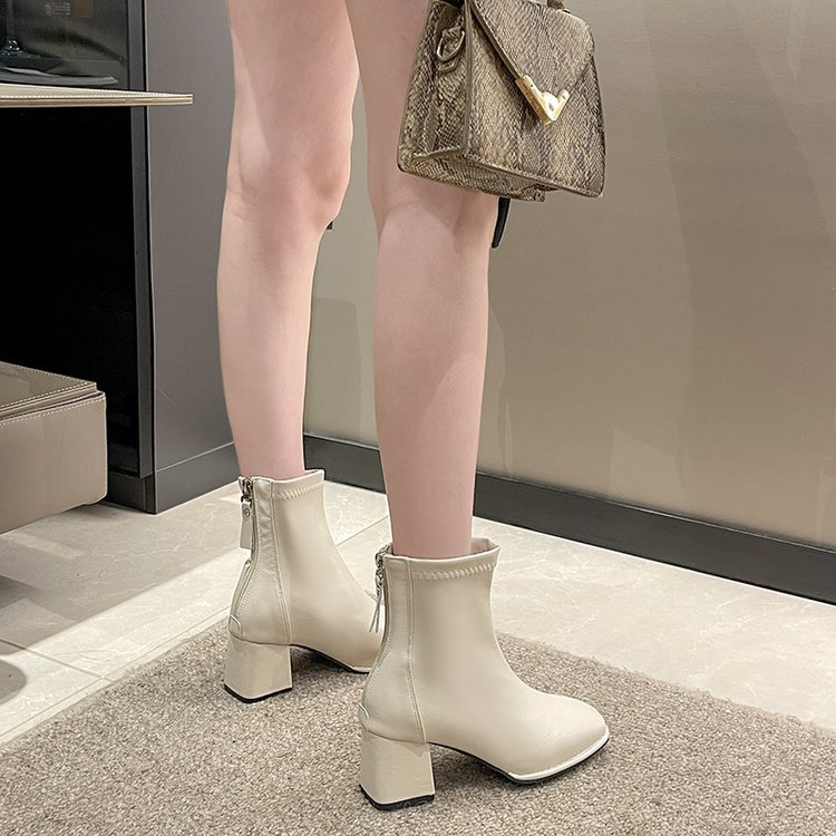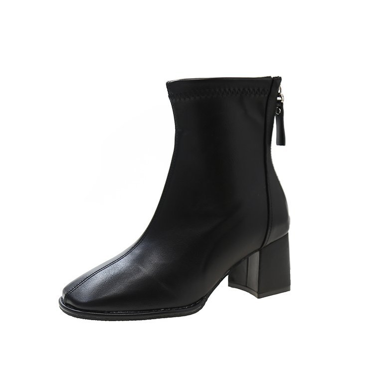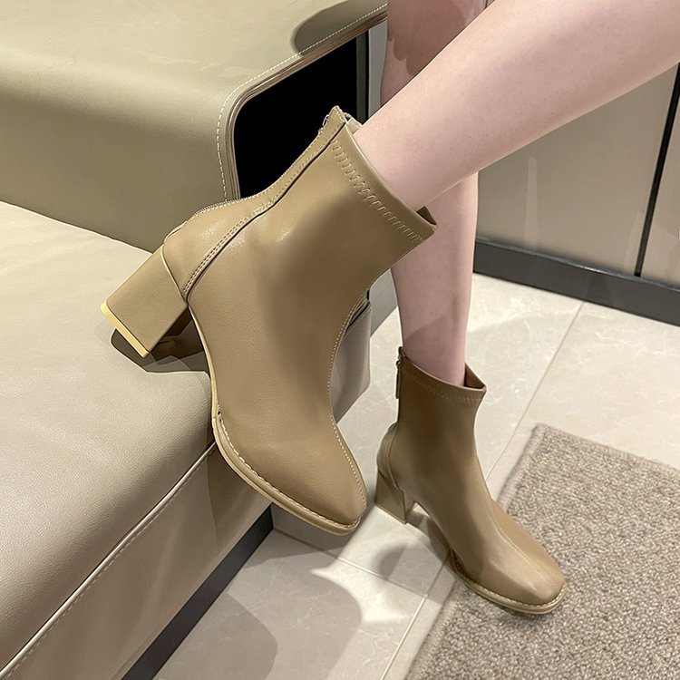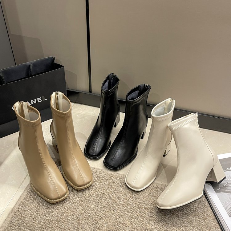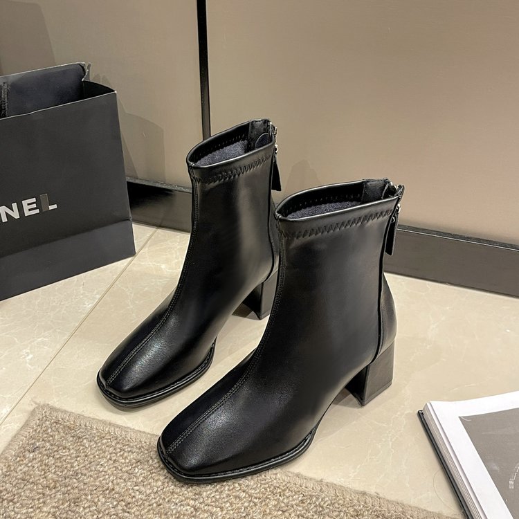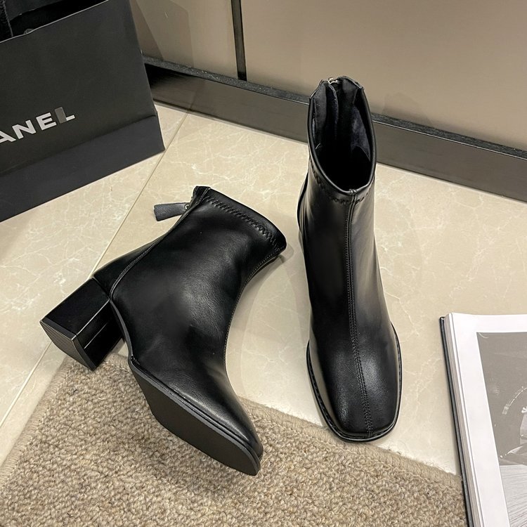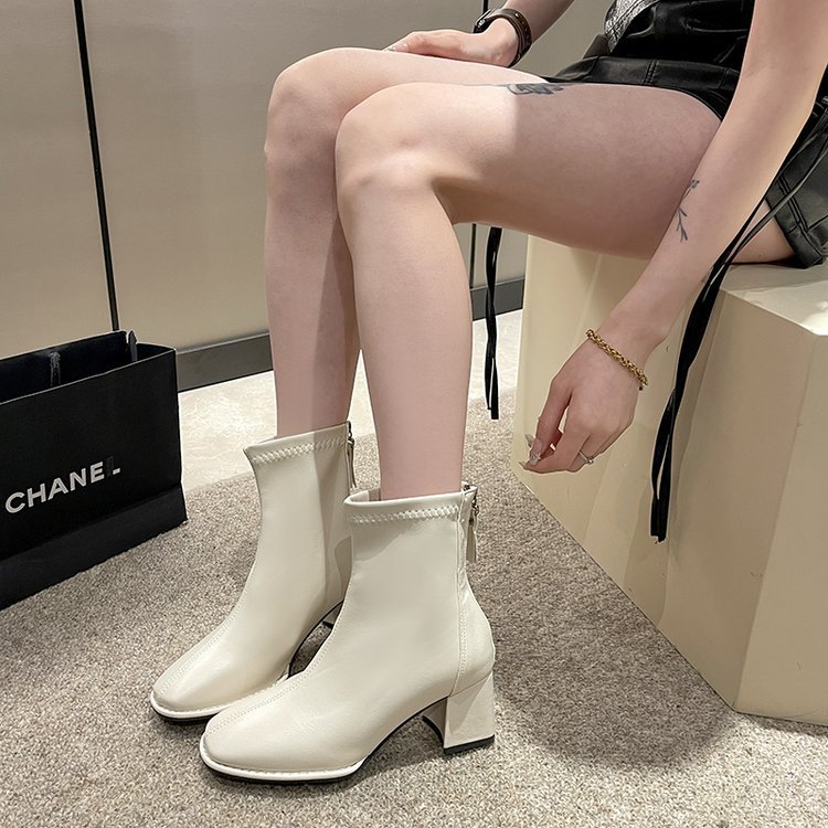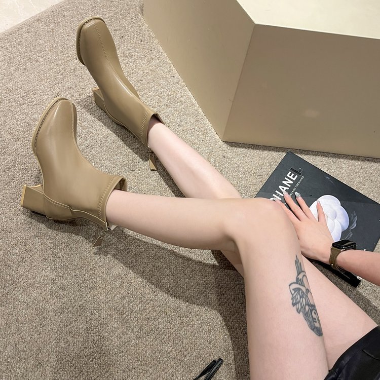 프랑스 스타일 청키 스몰 쇼트 부츠 여성용 2023 가을 신상품 마틴 유행 부드러운 가죽 스퀘어 토 모든 경기 얇은 부츠 스트레치 부츠스토어 가기