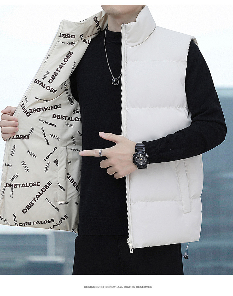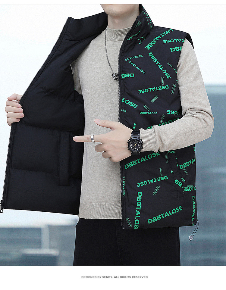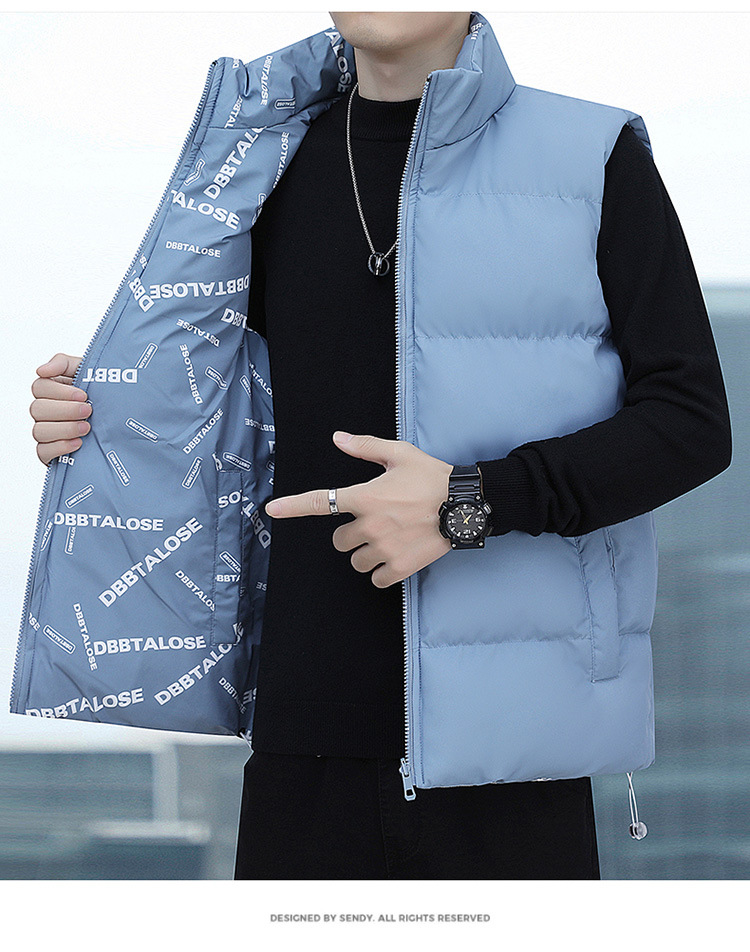 가을과 겨울 새로운 남성용 양면 웨어러블 조끼 한국 스타일 세로 칼라 두꺼운 따뜻한 다운 면 겉옷 민소매 조끼