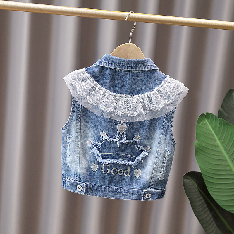 여아 데님 조끼 봄 가을 아동 자수 조끼 왕관 스타일 중소형 여아 아기 코트 조끼스토어 가기
