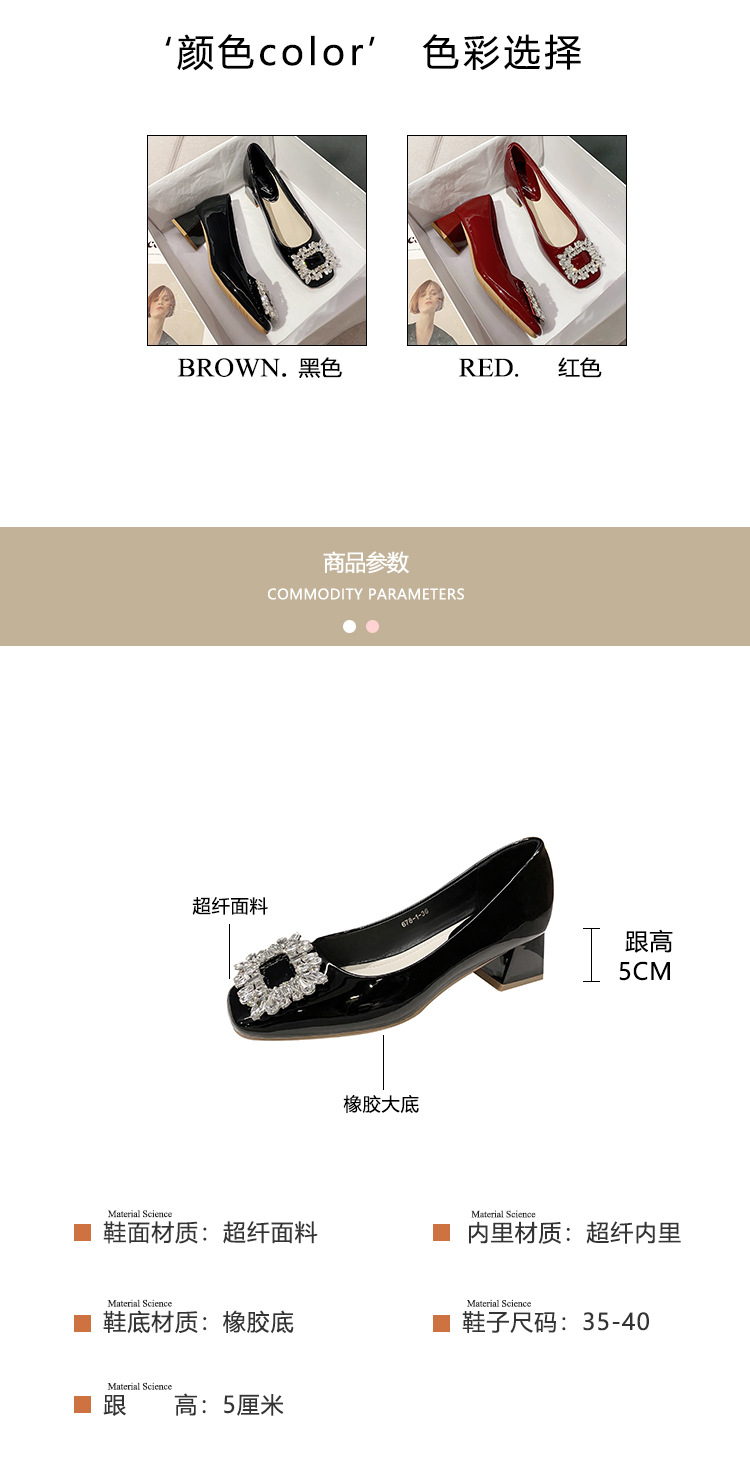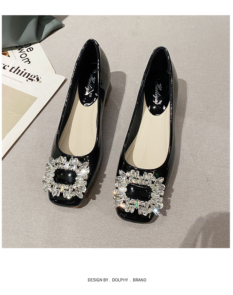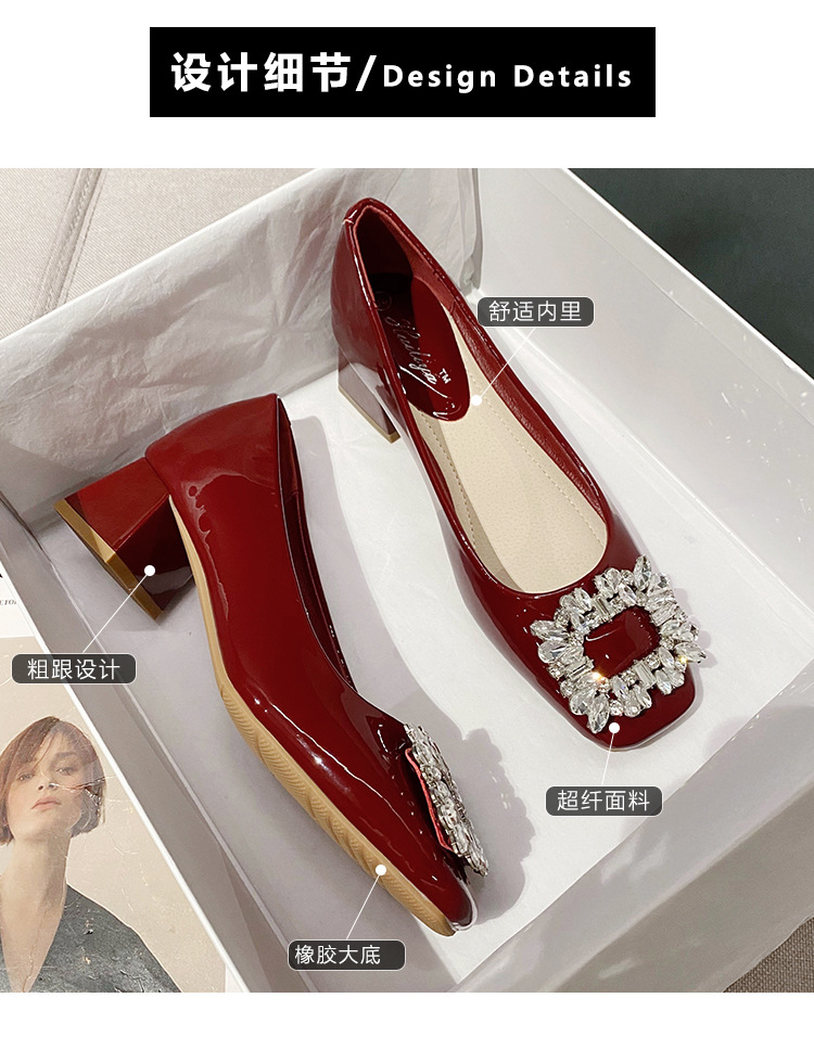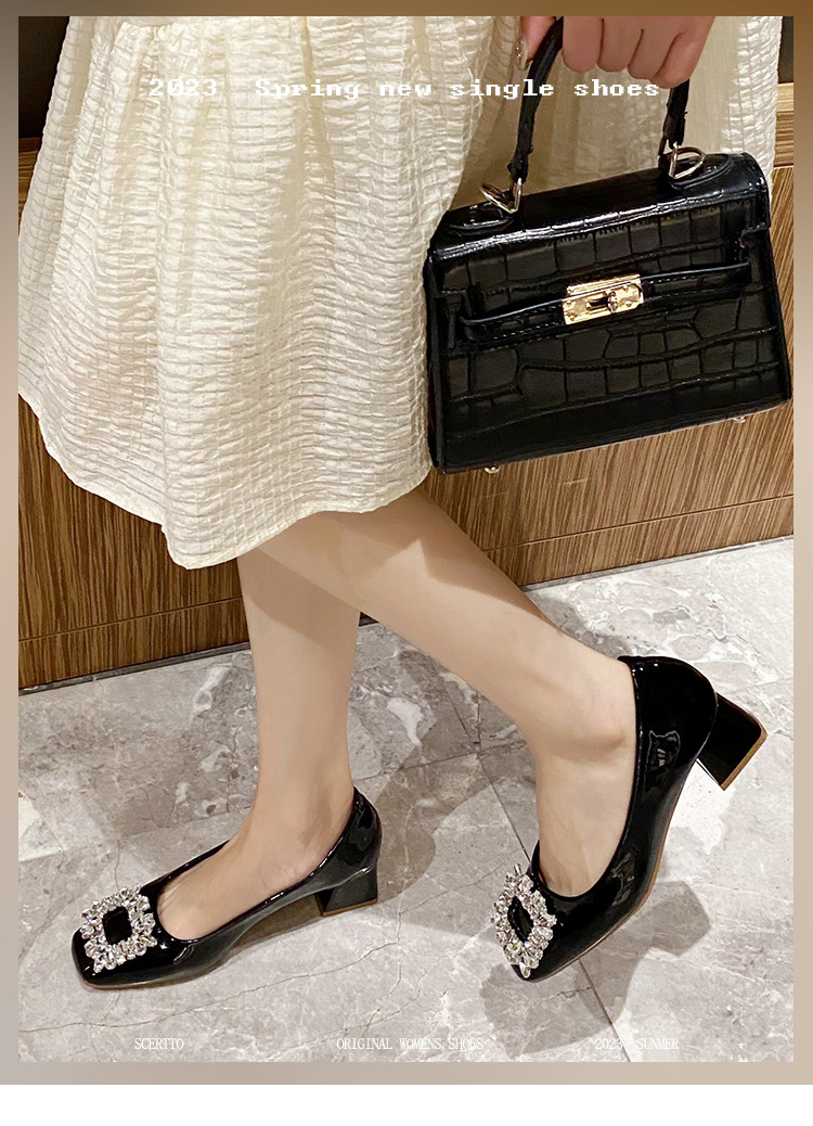 스퀘어 버클 라인 석 두꺼운 굽 신발 여성용 2023 새로운 에나멜 가죽 스퀘어 토 슈즈 미드 힐 통근 작업 신발스토어 가기