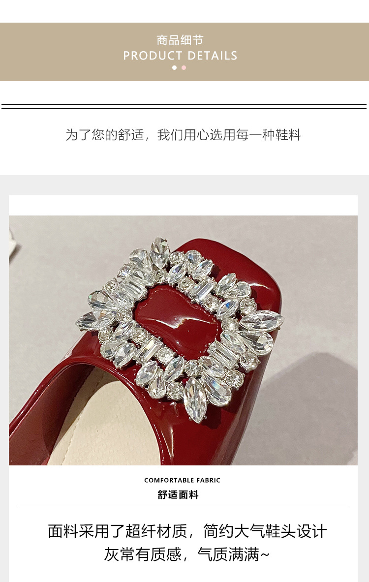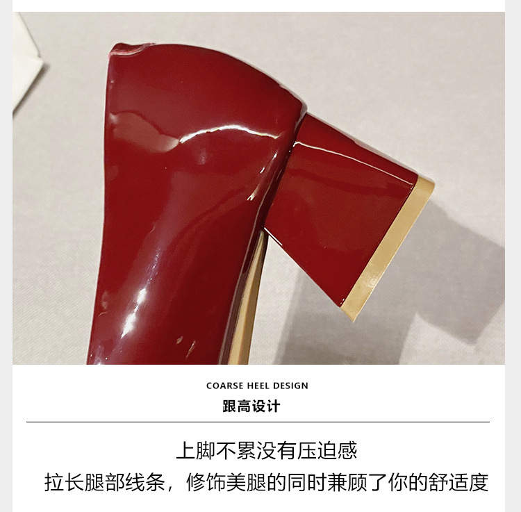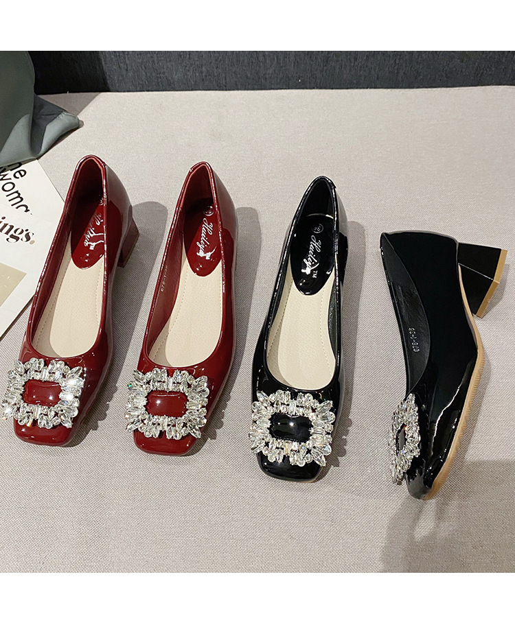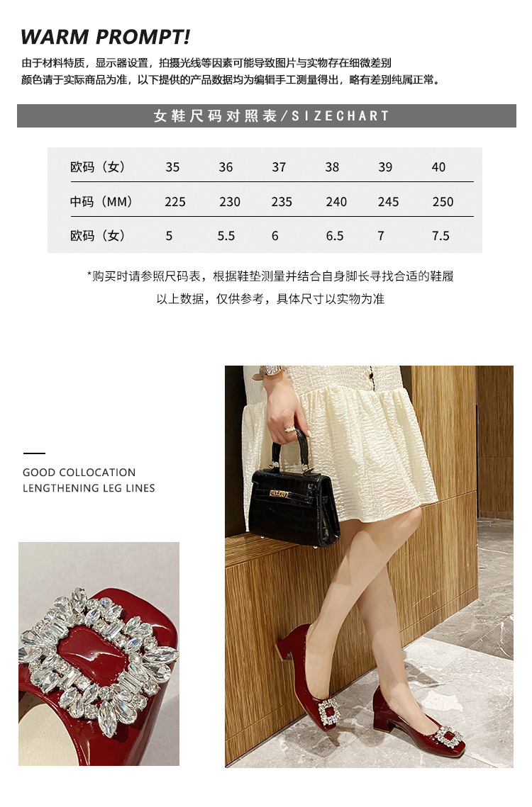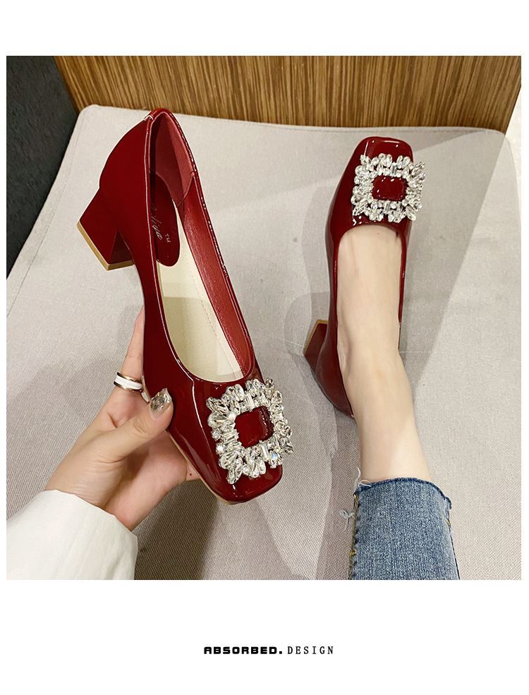 스퀘어 버클 라인 석 두꺼운 굽 신발 여성용 2023 새로운 에나멜 가죽 스퀘어 토 슈즈 미드 힐 통근 작업 신발스토어 가기