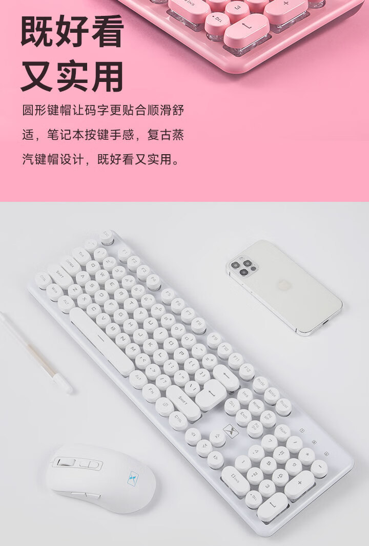 Ximmeng 무선 키보드 마우스 세트 충전식 노트북 태블릿 사무실 레트로 라운드 키 마우스