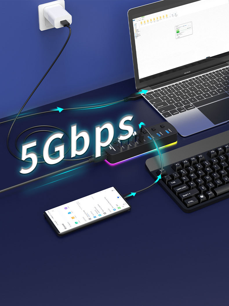 전원 공급 포트가있는 Type-c3.0hub 허브 USB7 허브 스플리터 컴퓨터 변환기 독립 스위치