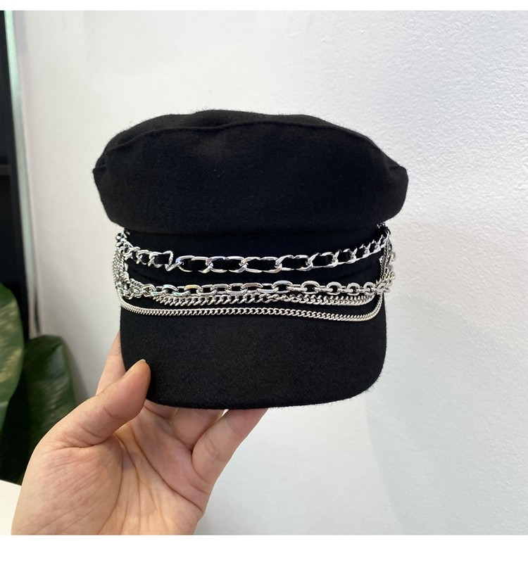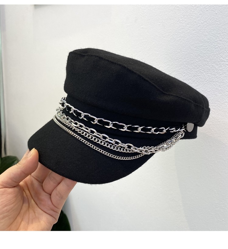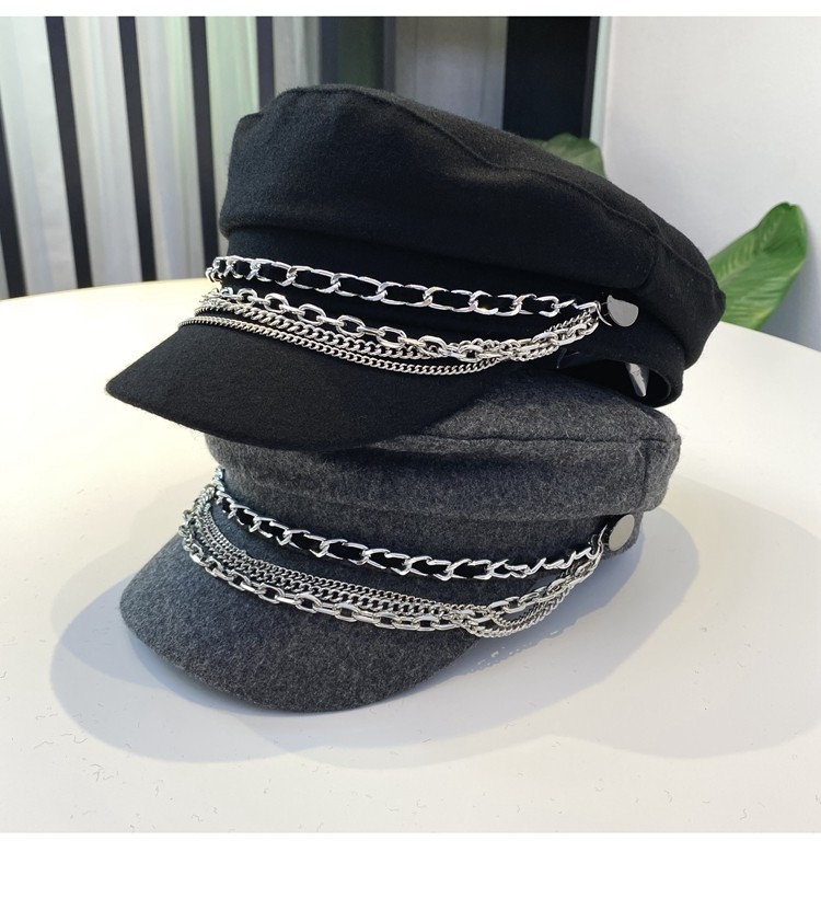 유럽과 미국 스타일 영국 복고풍 인터넷 연예인 울 체인 베레모 여성의 가을과 겨울 패션 우아한 개인화 된 스트리트 플랫 캡스토어 가기