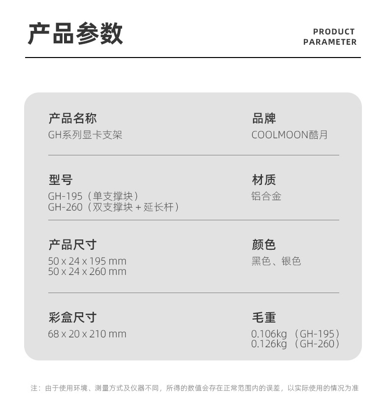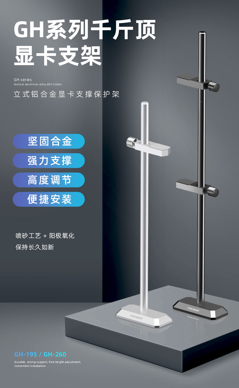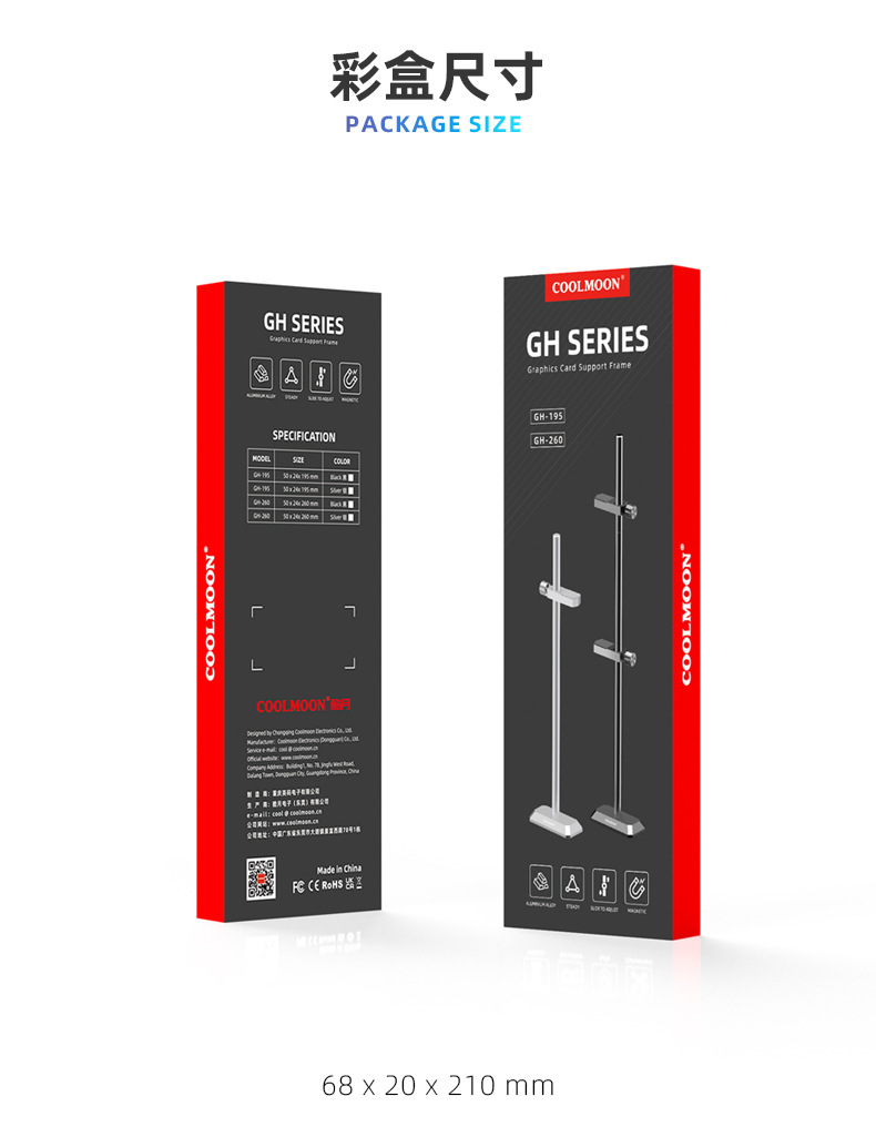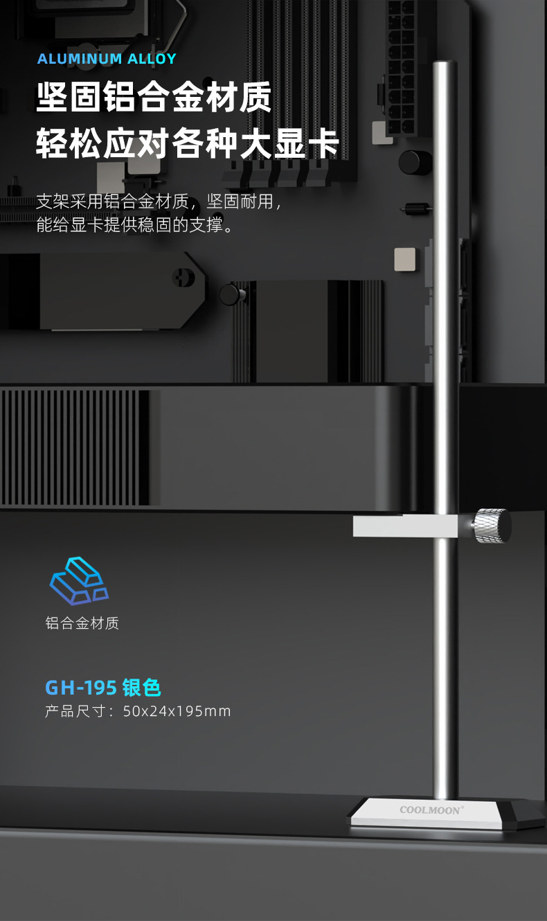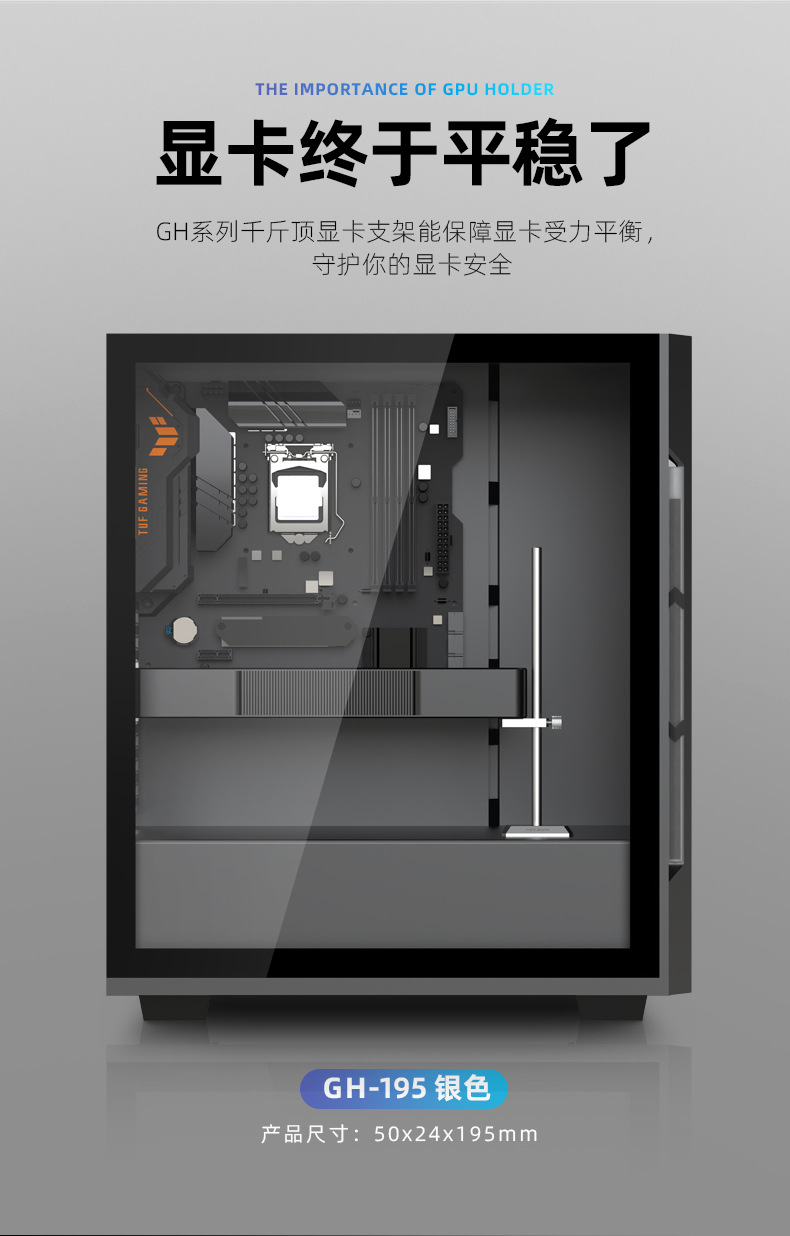 GH195显卡支架, 铝合金材质,强力支撑显卡,底部磁吸便捷安装,单箱尺寸:62.5*22.5*24cm,90pcs/box,10kg/box,支持跨境销售,可提供图片包!