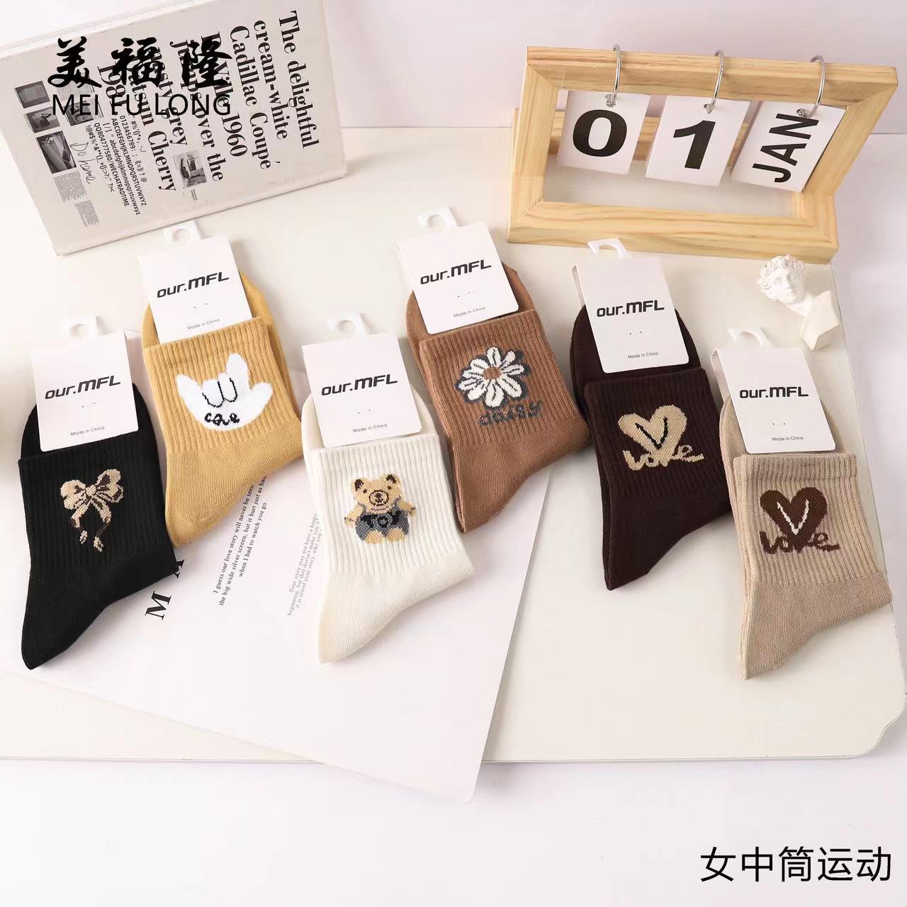 남자와 여자의 조수 양말 도매 가을과 겨울 새로운 학생 스포츠 양말 튜브 만화 작은 신선한 다크 브라운 면화 양말 모든 일치