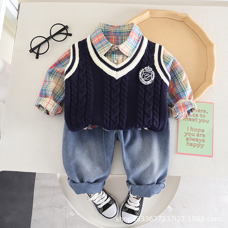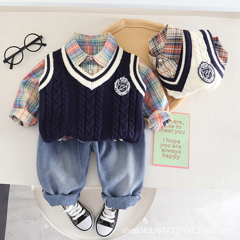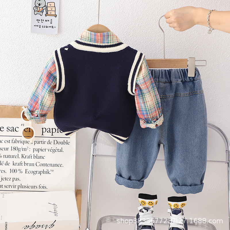 남아 가을 세트 2023 새로운 외국 스타일의 어린이 아기 학업 스웨터 3 피스 세트 머리카락 세대스토어 가기