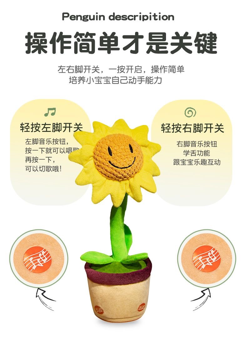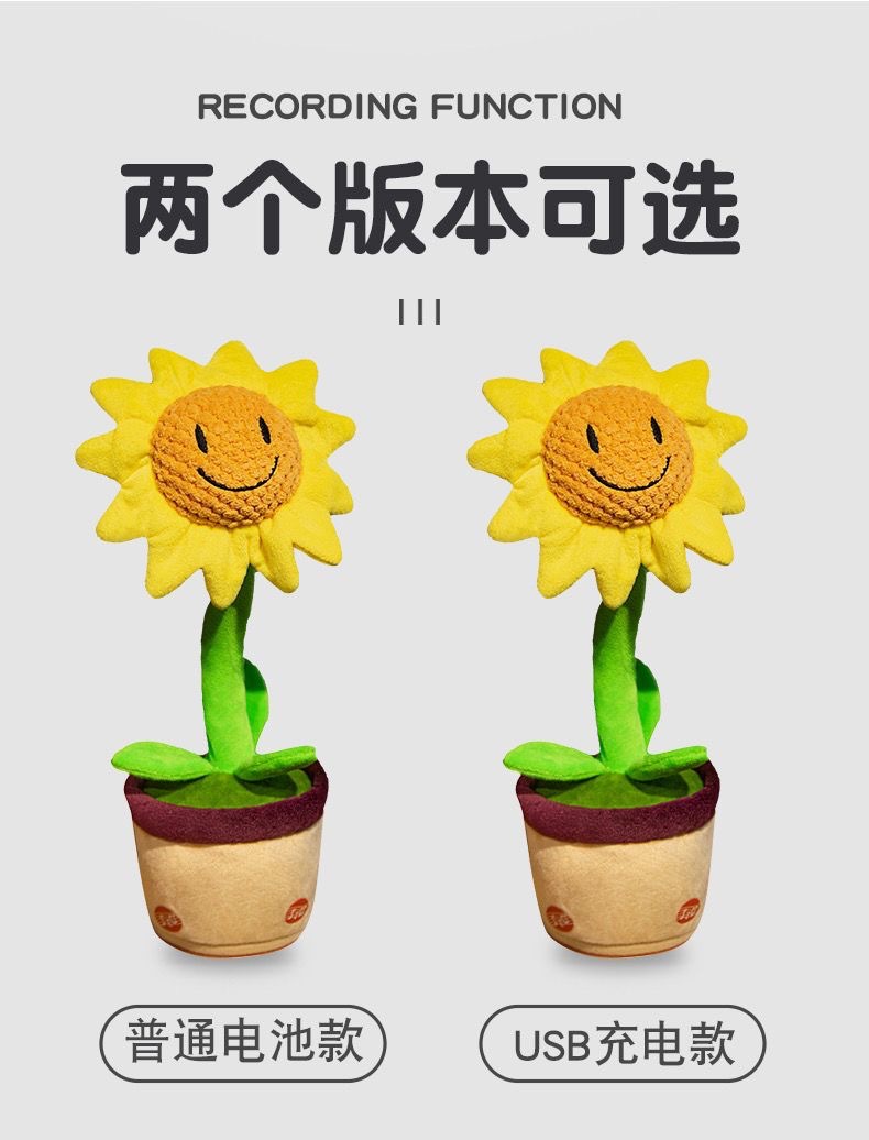 인터넷 연예인은 작은 정원에서 파고 빛나고 비틀고 말하는 법을 배니다. 해바라기 전기 플러시 장난감